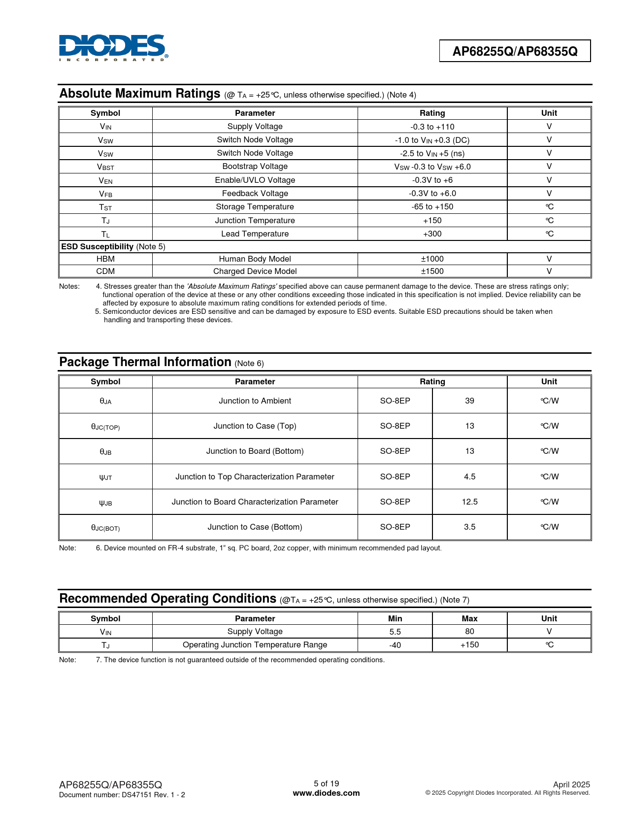 VIN Supply Voltage 5.5 80 V TJ Operating Junction Temperature Range -40 +150 °C Note: 7. The device function is not guaranteed outside of the recommended operating conditions. AP68255Q/AP68355Q 5 of 19 April 2025 Document number: DS47151 Rev. 1 - 2