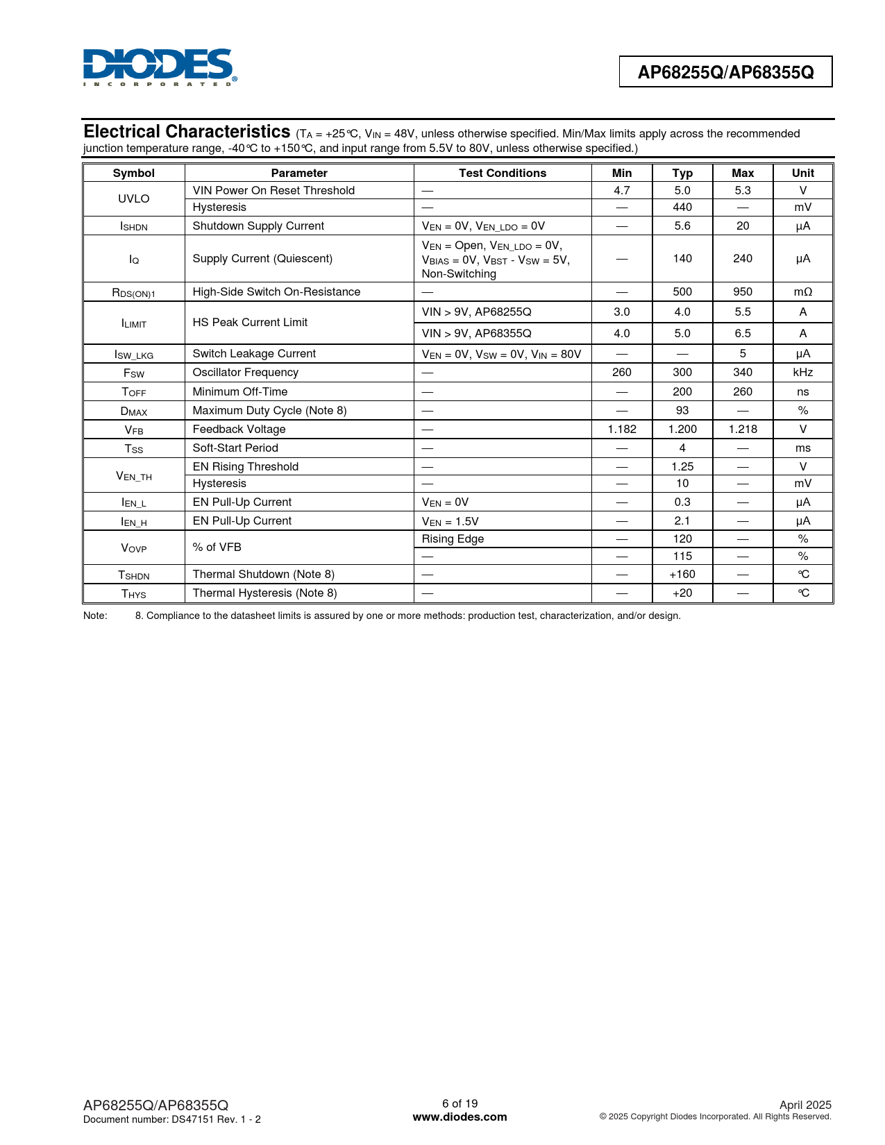AP68255Q/AP68355Q. Electrical Characteristics. Symbol. Parameter. Test Conditions. Min. Typ. Max. Unit. www.diodes.com