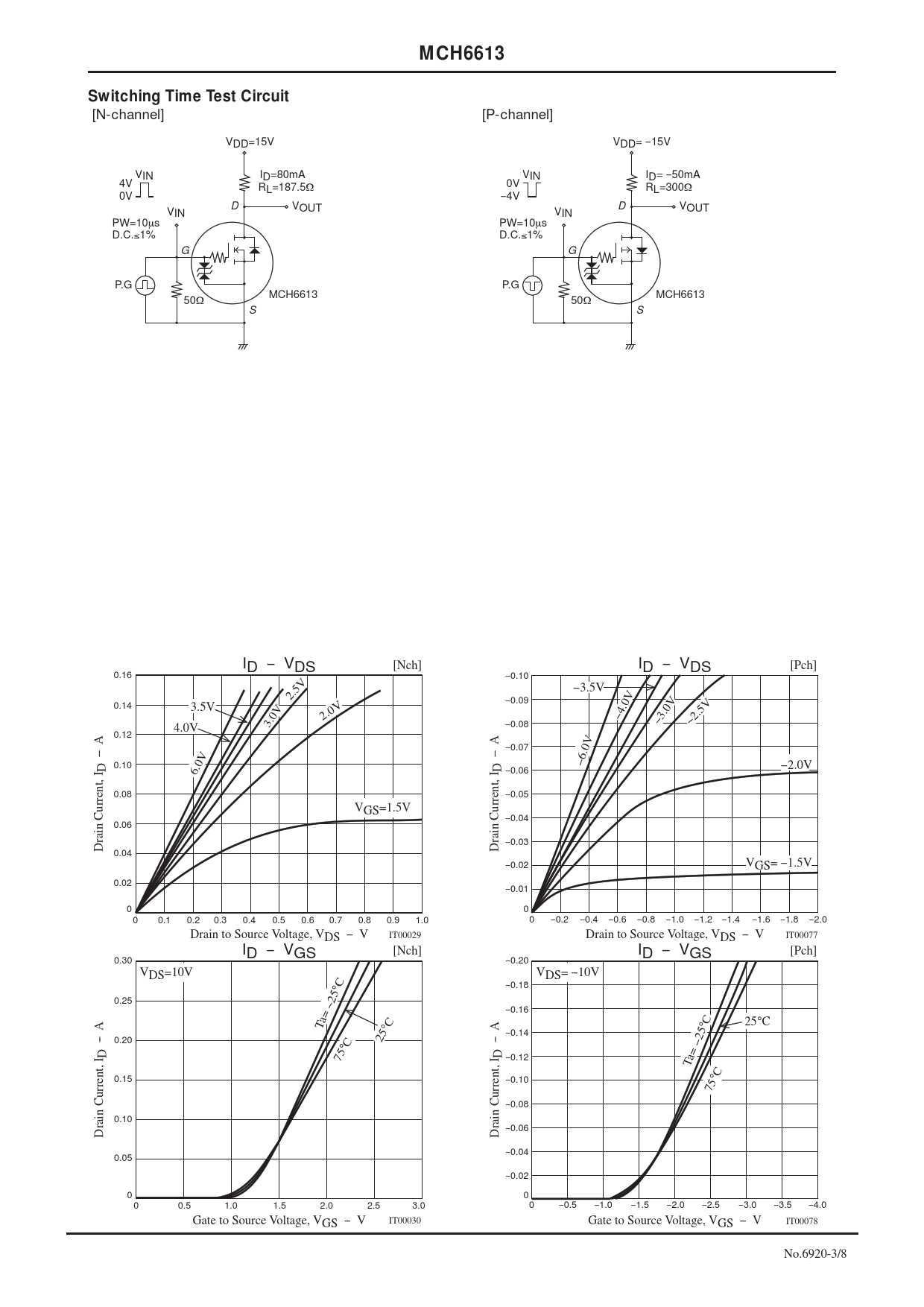 MCH6613. Switching Time Test Circuit. [N-channel] [P-channel]. VDD=15V VIN ID=80mA. RL=187.5Ω. D VIN VOUT VIN PW=10μs