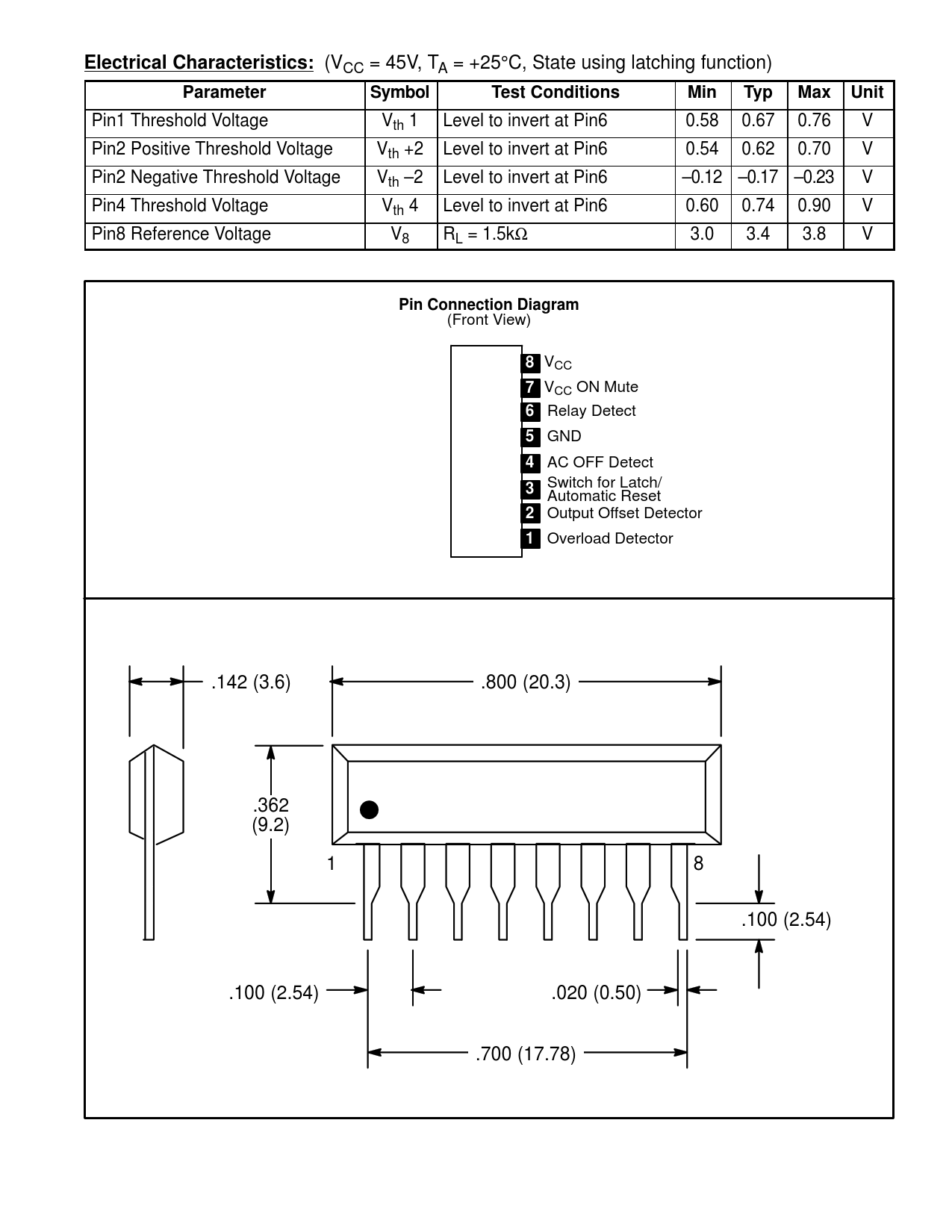 Pin1 Threshold Voltage Vth 1 Level to invert at Pin6 0.58 0.67 0.76 V Pin2 Positive Threshold Voltage Vth +2 Level to invert at Pin6 0.54 0.62 0.70 V Pin2 Negative Threshold Voltage Vth –2 Level to invert at Pin6 –0.12 –0.17 –0.23 V Pin4 Threshold Voltage Vth 4 Level to invert at Pin6 0.60 0.74 0.90 V Pin8 Reference Voltage V8 RL = 1.5kΩ 3.0 3.4 3.8 V
