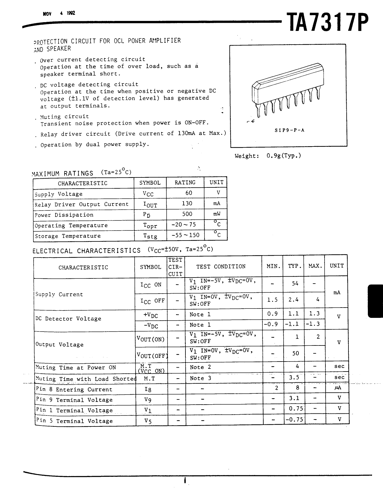 Protection Circuit for OCL Power Amplifier and Speaker in SIP-9-P-A Package