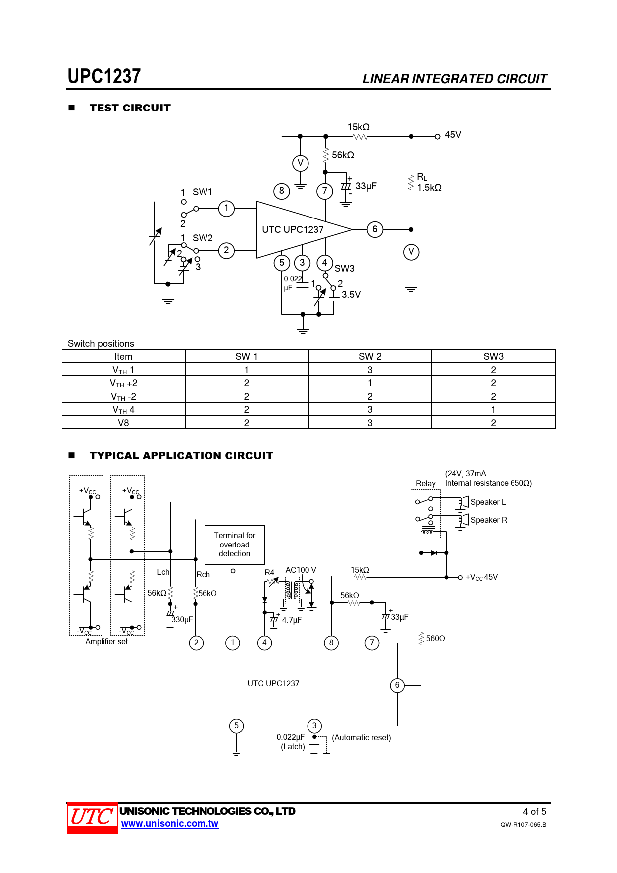 15kΩ 45V 56kΩ V + RL 1 SW1 8 7 33µF 1.5kΩ - 1 2 UTC UPC1237 6 1 SW2 2 2 V 5 3 4 3 SW3 0.022 1 2 µF 3.5V Switch positions Item SW 1 SW 2 SW3 VTH 1 1 3 2 VTH +2 2 1 2 VTH -2 2 2 2 VTH 4 2 3 1 V8 2 3 2