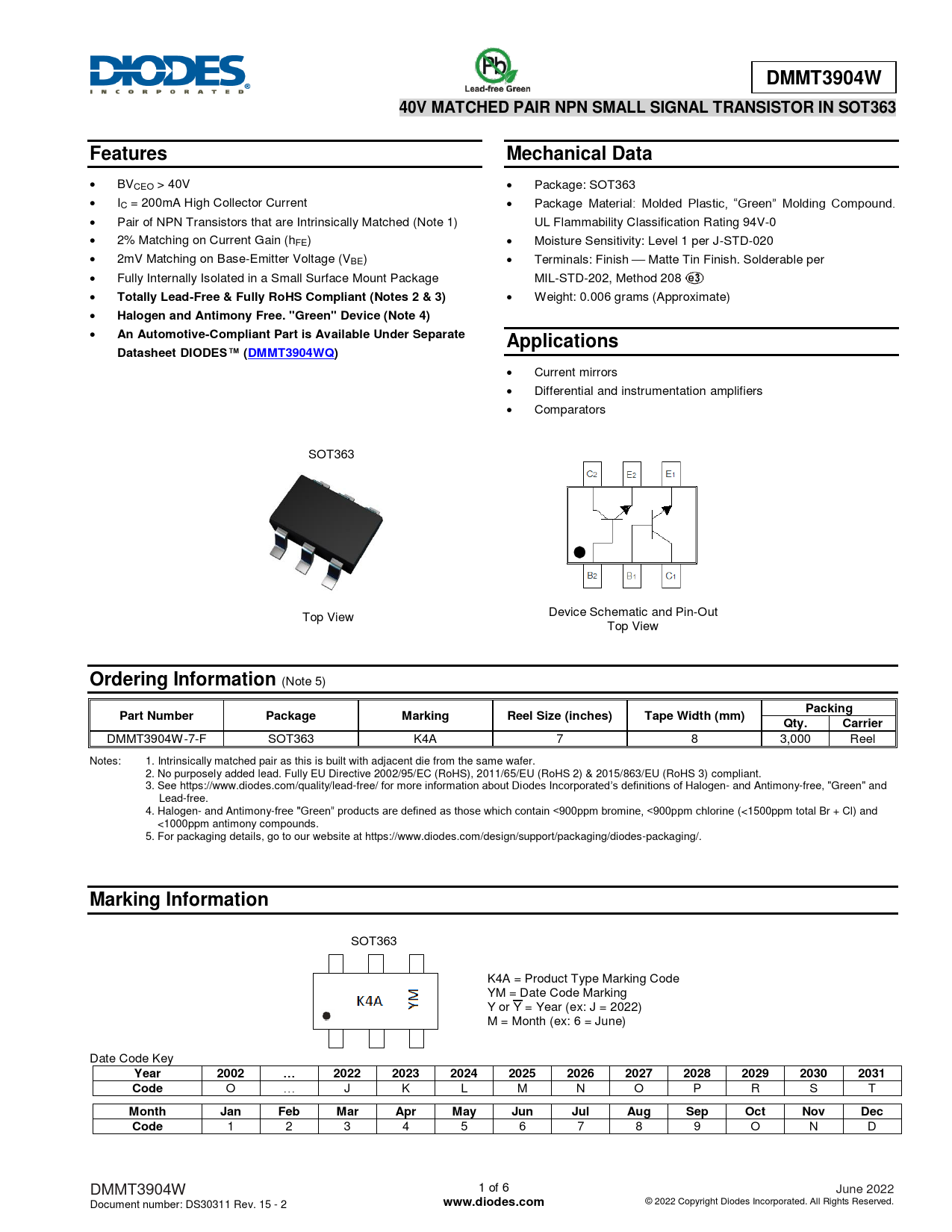 DMMT3904W -7-F SOT363 K4A 7 8 3,000 Reel Notes: 1. Intrinsically matched pair as this is built with adjacent die from the same wafer. 2. No purposely added lead. Fully EU Directive 2002/95/EC (RoHS), 2011/65/EU (RoHS 2) & 2015/863/EU (RoHS 3) compliant. 3. See https://www.diodes.com/quality/lead-free/ for more information about Diodes Incorporated’s definitions of Halogen- and Antimony-free, "Green" and Lead-free. 4. Halogen- and Antimony-free "Green” products are defined as those which contain <900ppm bromine, <900ppm chlorine (<1500ppm total Br + Cl) and <1000ppm antimony compounds. 5. For packaging details, go to our website at https://www.diodes.com/design/support/packaging/diodes-packaging/.