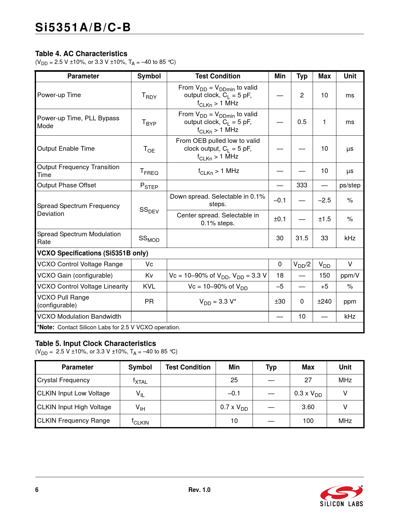 S i 5 3 5 1 A / B / C - B. Table 4. AC Characteristics. Parameter. Symbol. Test Condition. Min. Typ. Max. Unit