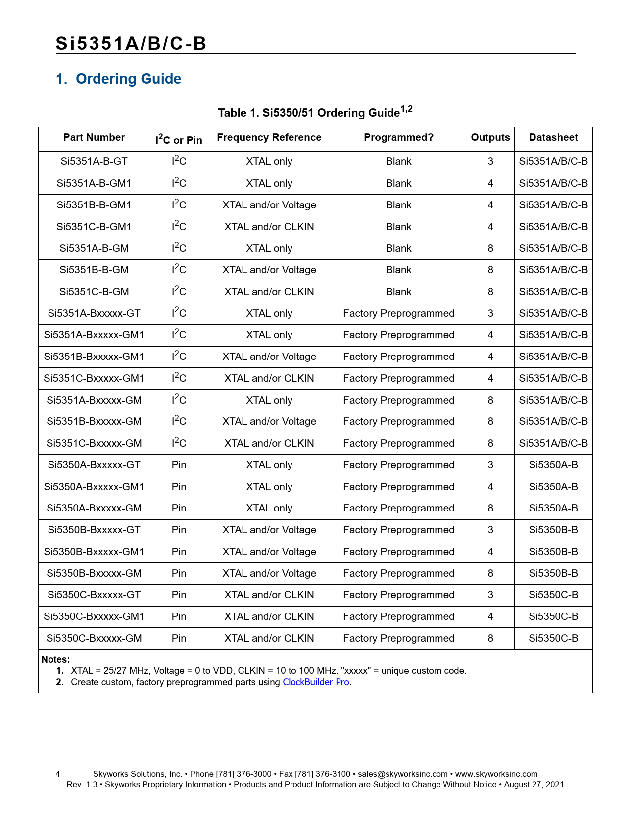 Si5351A/B/C-B. 1. Ordering Guide. Table 1. Si5350/51 Ordering Guide1,2. Part Number. I2C or Pin. Frequency Reference. Programmed?