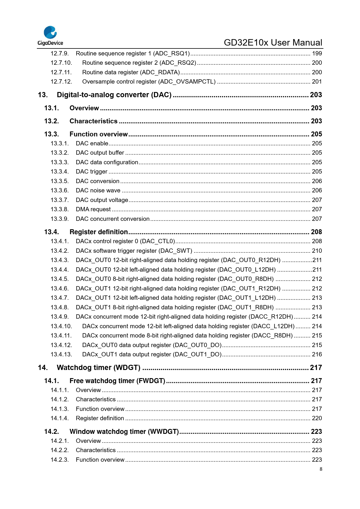 13. Digital-to-analog converter (DAC) ... 203. 13.1. Overview ... 203. 13.2. Characteristics ... 203. 13.3. Function overview .. 205