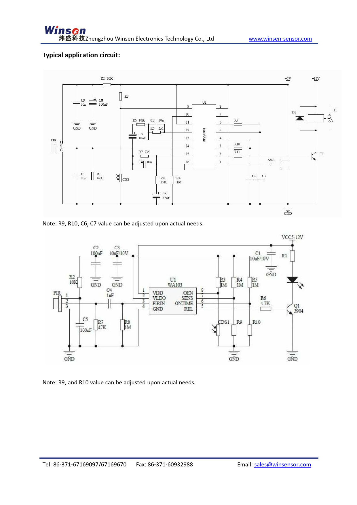 Zhengzhou Winsen Electronics Technology Co., Ltd www.winsen-sensor.com Typical application circuit: Note: R9, R10, C6, C7 value can be adjusted upon actual needs. Note: R9, and R10 value can be adjusted upon actual needs. Tel: 86-371-67169097/67169670 Fax: 86-371-60932988 Email: sales@winsensor.com