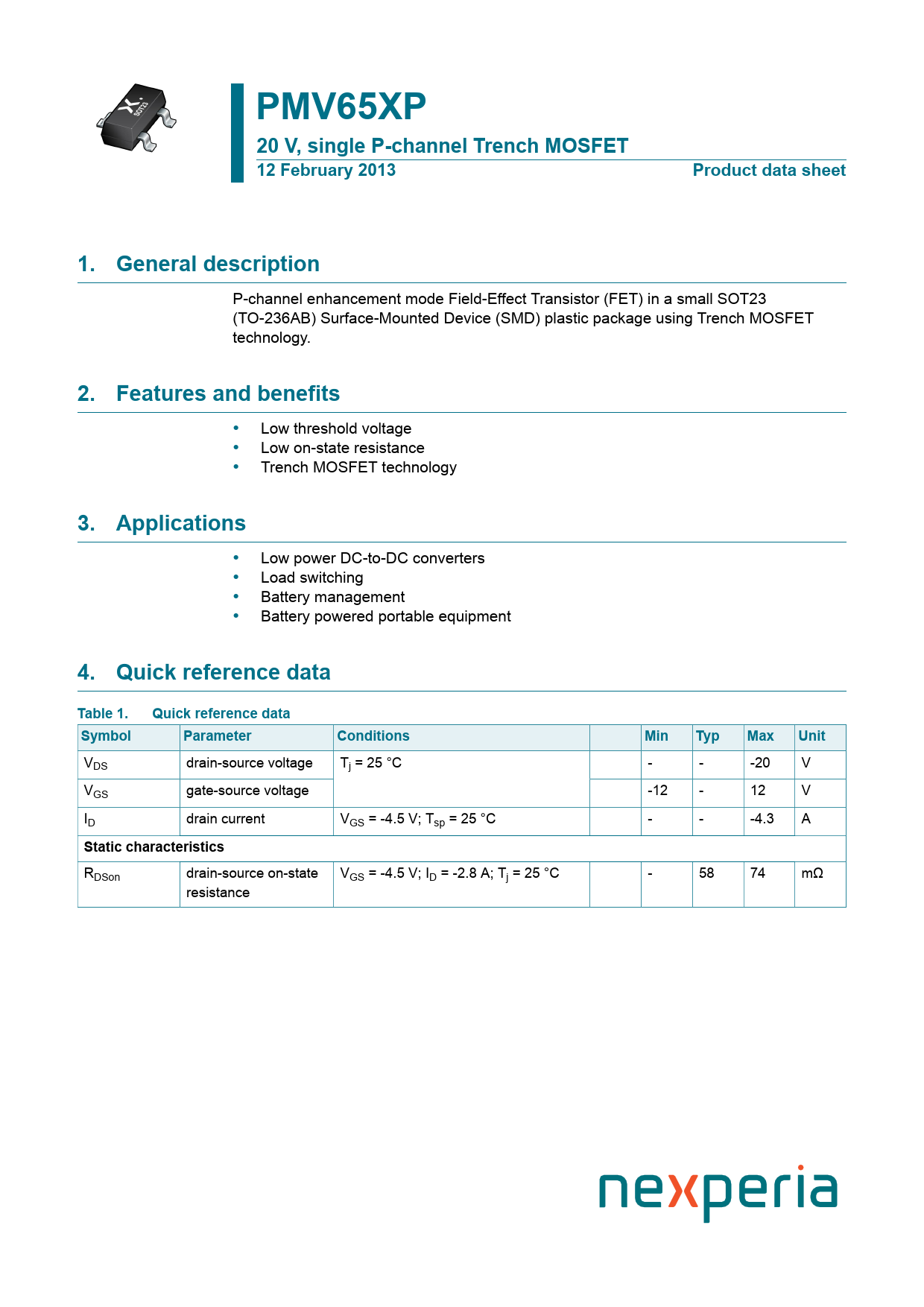 | Seiten / Seite | 14 / 1 — PMV65XP. 20 V, single P-channel Trench MOSFET. 12 February 2013. Product … |
