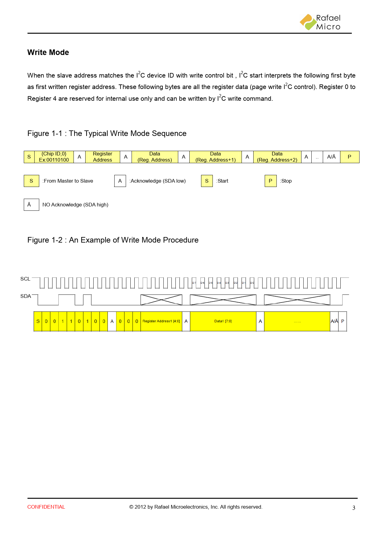 When the slave address matches the I2C device ID with write control bit , I2C start interprets the following first byte as first written register address. These following bytes are all the register data (page write I2C control). Register 0 to Register 4 are reserved for internal use only and can be written by I2C write command. Figure 1-1 : The Typical Write Mode Sequence {Chip ID,0} Register Data Data Data S A A A A A .. A/Ā P Ex:00110100 Address (Reg. Address) (Reg. Address+1) (Reg. Address+2) S :From Master to Slave A :Acknowledge (SDA low) S :Start P :Stop Ā NO Acknowledge (SDA high) Figure 1-2 : An Example of Write Mode Procedure SCL SDA CONFIDENTIAL © 2012 by Rafael Microelectronics, Inc. All rights reserved. 3