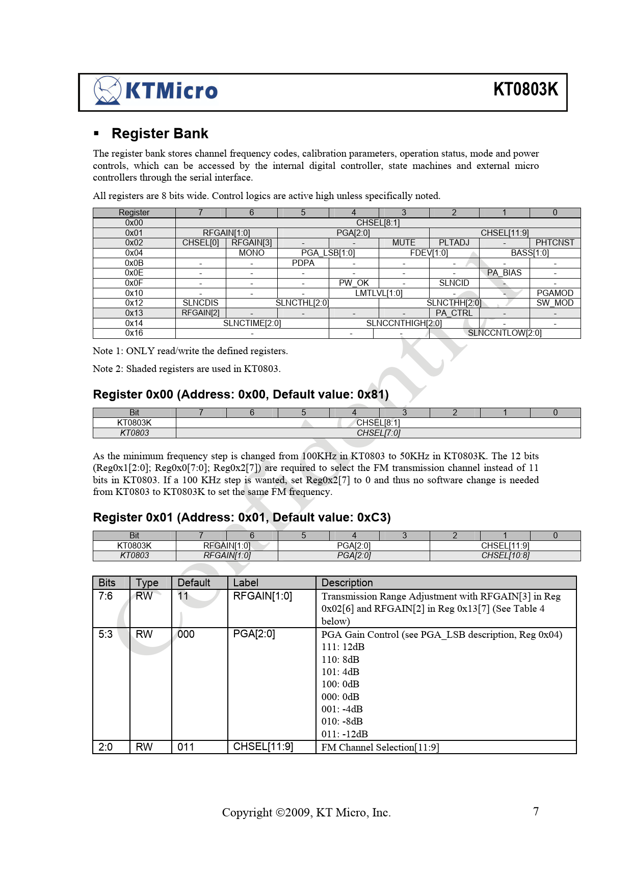 Bit 7 6 5 4 3 2 1 0 KT0803K RFGAIN[1:0] PGA[2:0] CHSEL[11:9] KT0803 RFGAIN[1:0] PGA[2:0] CHSEL[10:8] Bits Type Default Label Description 7:6 RW 11 RFGAIN[1:0] Transmission Range Adjustment with RFGAIN[3] in Reg 0x02[6] and RFGAIN[2] in Reg 0x13[7] (See Table 4 below) 5:3 RW 000 PGA[2:0] PGA Gain Control (see PGA_LSB description, Reg 0x04) 111: 12dB 110: 8dB 101: 4dB 100: 0dB 000: 0dB 001: -4dB 010: -8dB 011: -12dB 2:0 RW 011 CHSEL[11:9] FM Channel Selection[11:9] Copyright ©2009, KT Micro, Inc. 7