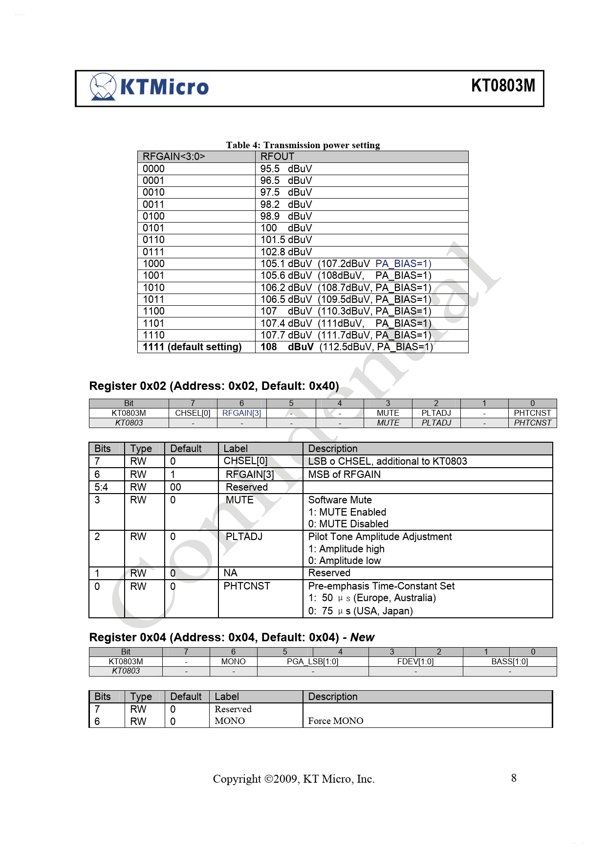 Bit 7 6 5 4 3 2 1 0 KT0803M - MONO PGA_LSB[1:0] FDEV[1:0] BASS[1:0] KT0803 - - - - - Bits Type Default Label Description 7 RW 0 Reserved 6 RW 0 MONO Force MONO Copyright ©2009, KT Micro, Inc. 8 Datasheet pdf - http://www.DataSheet4U.net/