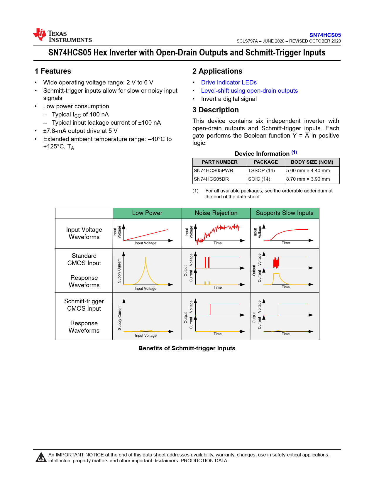 SN74HCS05. www.ti.com. SN74HCS05 Hex Inverter with Open-Drain Outputs and Schmitt-Trigger Inputs. 1 Features. 2 Applications
