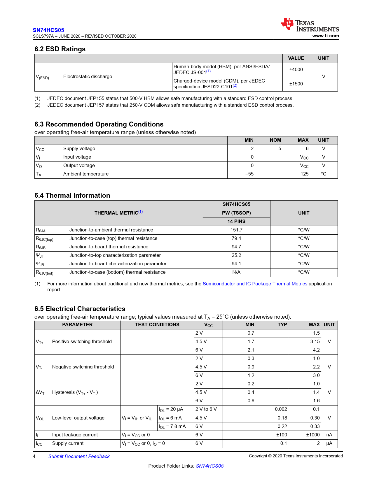 SN74HCS05. www.ti.com. 6.2 ESD Ratings. VALUE. UNIT. 6.3 Recommended Operating Conditions. MIN. NOM. MAX. 6.4 Thermal Information