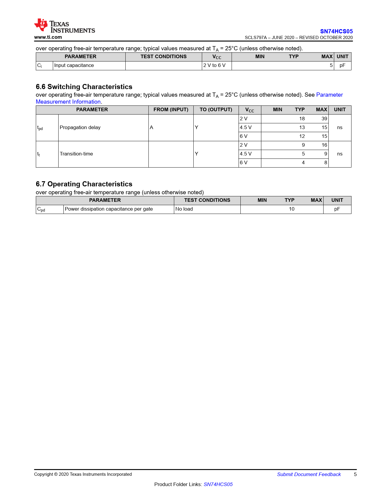SN74HCS05. www.ti.com. PARAMETER. TEST CONDITIONS. VCC. MIN. TYP. MAX UNIT. 6.6 Switching Characteristics. FROM (INPUT). TO (OUTPUT). MAX. UNIT
