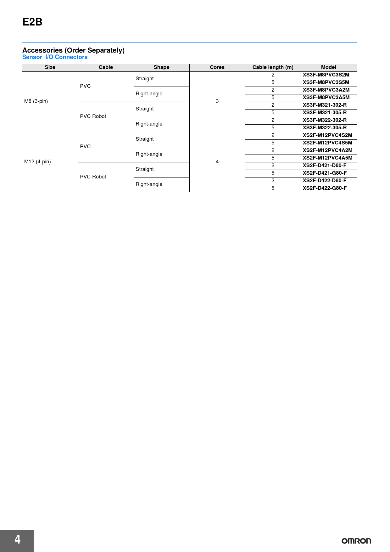 E2B. Accessories (Order Separately) Sensor I/O Connectors. Size. Cable. Shape. Cores. Cable length (m). Model. XS3F-M8PVC3S2M