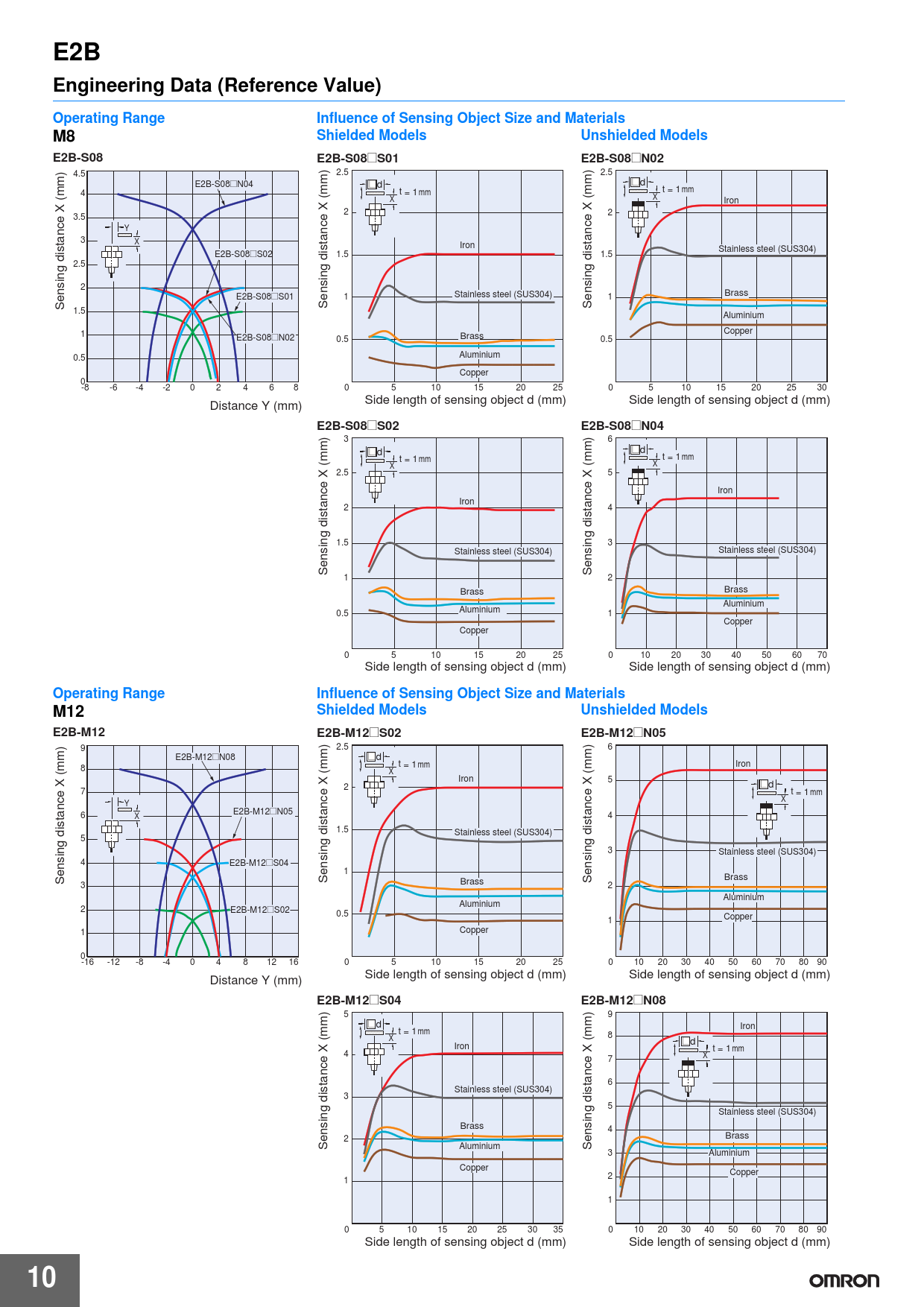 E2B Engineering Data (Reference Value) Operating Range Influence of Sensing Object Size and Materials M8 Shielded Models Unshielded Models E2B-S08 E2B-S08