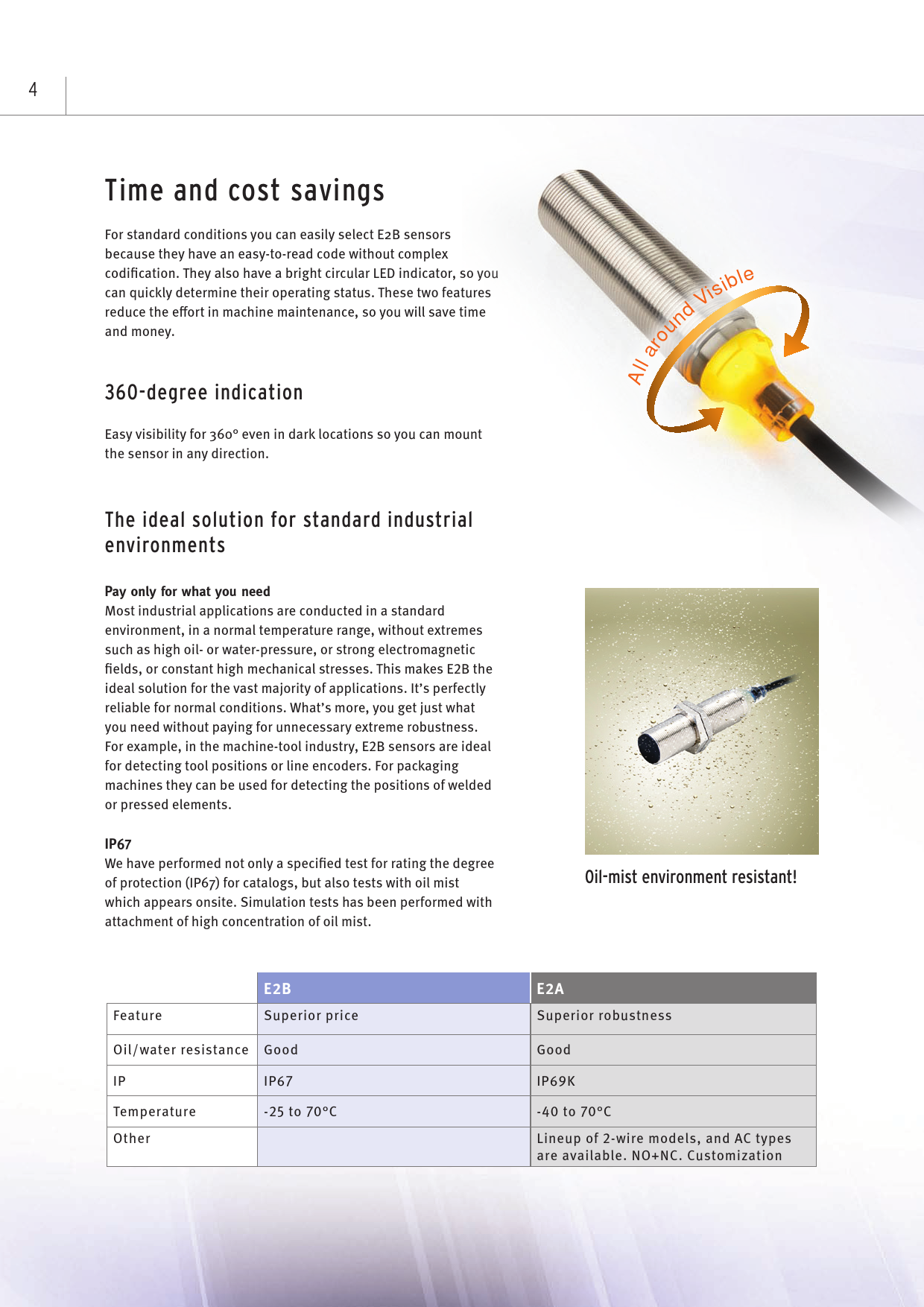 4 Time and cost savings For standard conditions you can easily select E2B sensors because they have an easy-to-read code without complex codification. They also have a bright circular LED indicator, so you can quickly determine their operating status. These two features reduce the effort in machine maintenance, so you wil save time and money. 360-degree indication Al around Visible Easy visibility for 360° even in dark locations so you can mount the sensor in any direction. The ideal solution for standard industrial environments Pay only for what you need Most industrial applications are conducted in a standard environment, in a normal temperature range, without extremes such as high oil- or water-pressure, or strong electromagnetic fields, or constant high mechanical stresses. This makes E2B the ideal solution for the vast majority of applications. It’s perfectly reliable for normal conditions. What’s more, you get just what you need without paying for unnecessary extreme robustness. For example, in the machine-tool industry, E2B sensors are ideal for detecting tool positions or line encoders. For packaging machines they can be used for detecting the positions of welded or pressed elements. IP67 We have performed not only a specified test for rating the degree of protection (IP67) for catalogs, but also tests with oil mist Oil-mist environment resistant! which appears onsite. Simulation tests has been performed with attachment of high concentration of oil mist. E2BE2A Feature Superior price Superior robustness Oil/water resistance Good Good IP IP67 IP69K Temperature -25 to 70°C -40 to 70°C Other Lineup of 2-wire models, and AC types are available. NO+NC. Customization