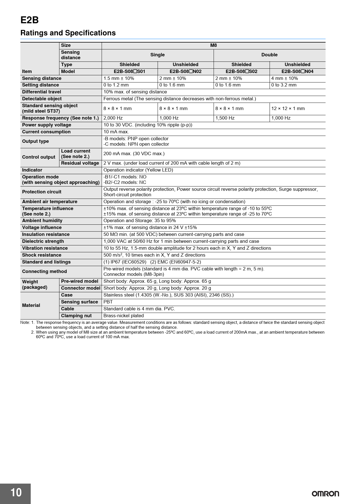 E2B Ratings and Specifications Size Sensing Single Double distance Type Shielded Unshielded Item Model E2B-S08 S01 N02 S02 N04