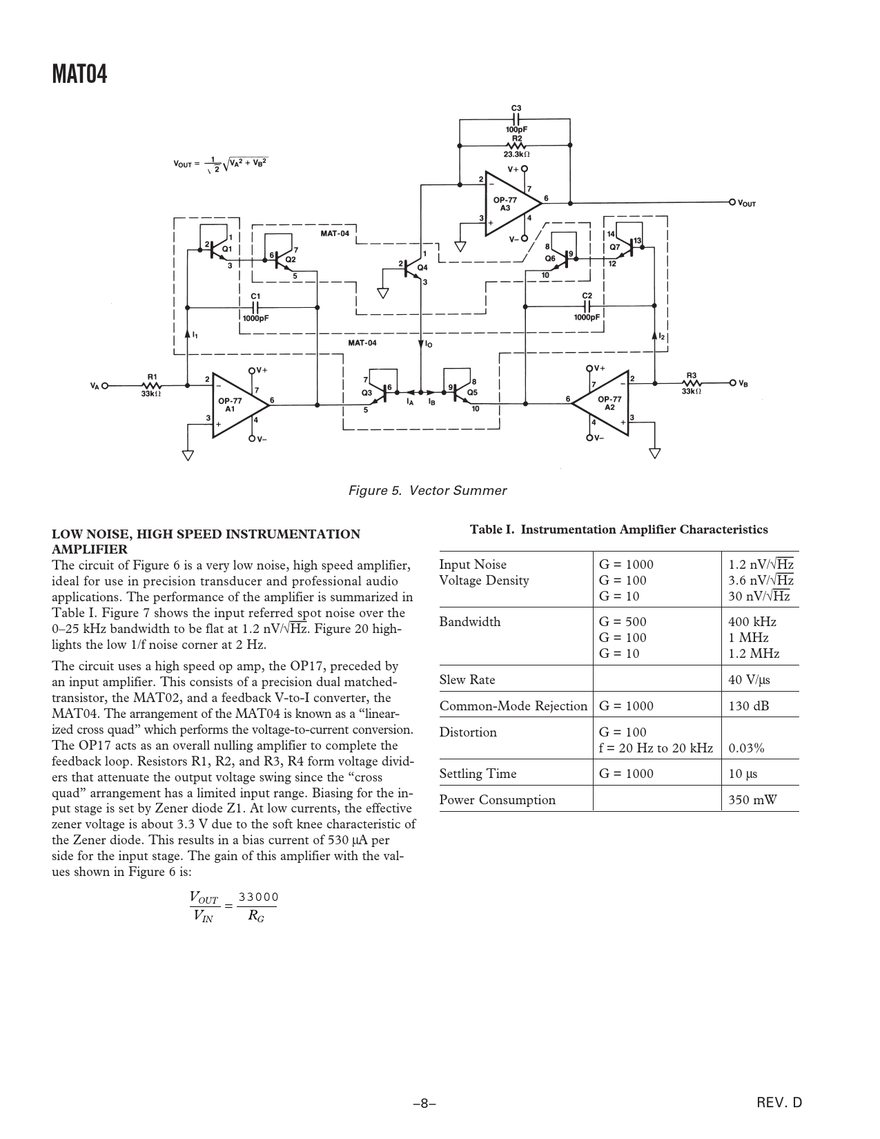 MAT04 LOW NOISE, HIGH SPEED INSTRUMENTATION Table I Instrumentation Amplifier Characteristics AMPLIFIER
