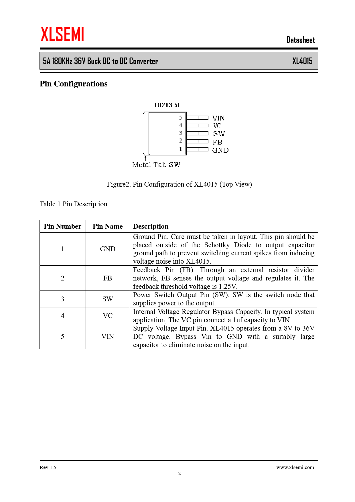 Datasheet5A 180KHz 36V Buck DC to DC Converter XL4015Pin Configurations Figure2. Pin Configuration of XL4015 (Top View) Table 1 Pin Description Pin NumberPin NameDescription Ground Pin. Care must be taken in layout. This pin should be placed outside of the Schottky Diode to output capacitor 1 GND ground path to prevent switching current spikes from inducing voltage noise into XL4015. Feedback Pin (FB). Through an external resistor divider 2 FB network, FB senses the output voltage and regulates it. The feedback threshold voltage is 1.25V. Power Switch Output Pin (SW). SW is the switch node that 3 SW supplies power to the output. Internal Voltage Regulator Bypass Capacity. In typical system 4 VC application, The VC pin connect a 1uf capacity to VIN. Supply Voltage Input Pin. XL4015 operates from a 8V to 36V 5 VIN DC voltage. Bypass Vin to GND with a suitably large capacitor to eliminate noise on the input. Rev 1.5 www.xlsemi.com 2