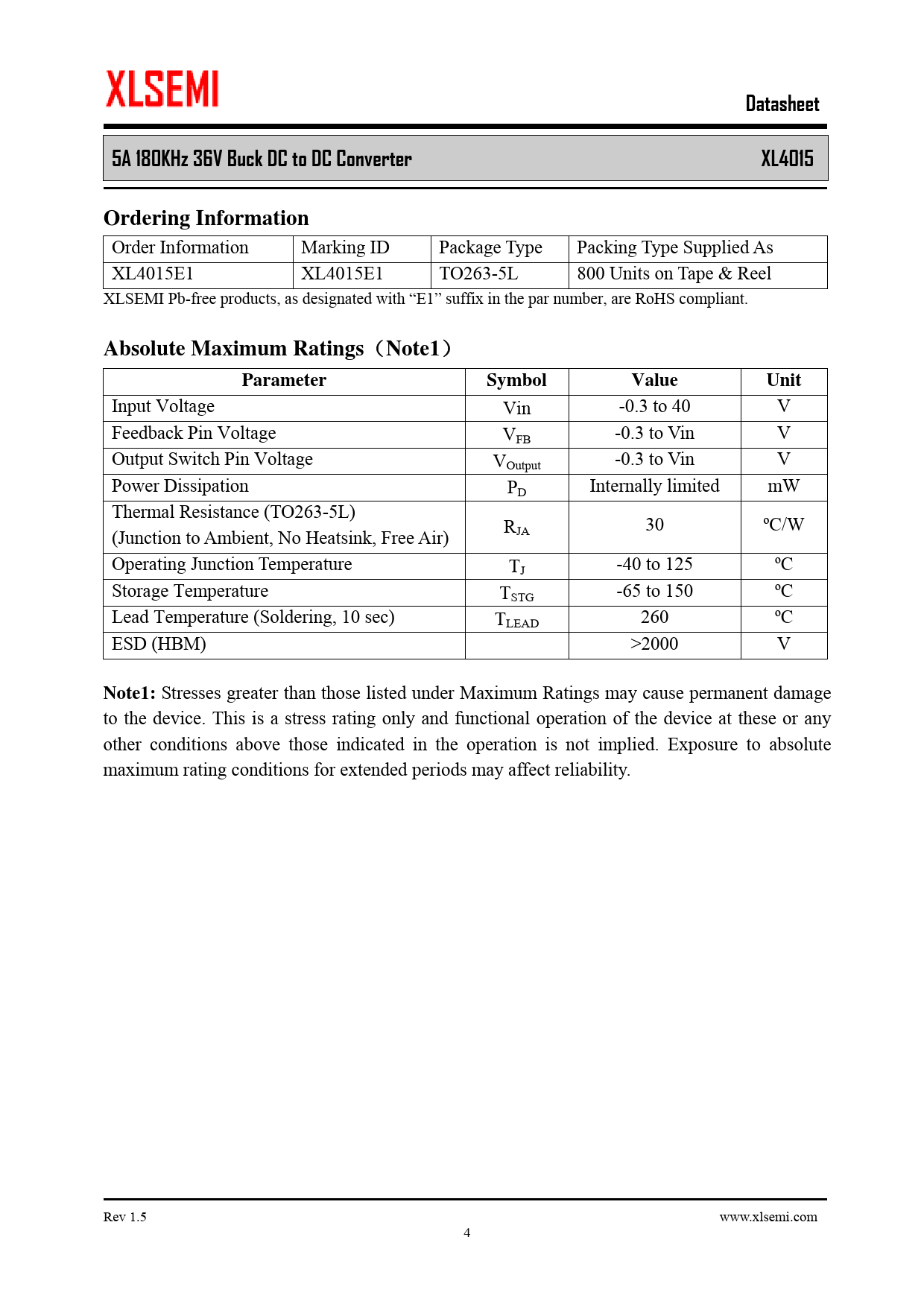 Datasheet 5A 180KHz 36V Buck DC to DC Converter XL4015 Ordering Information Absolute Maximum Ratings Note1 Parameter Symbol