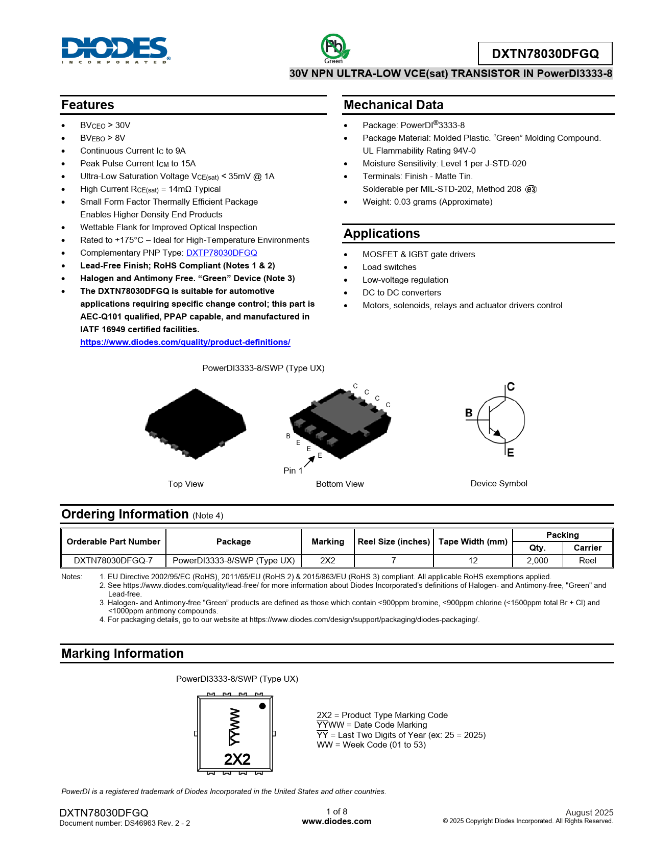 PowerDI3333-8/SWP (Type UX) W 2X2 = Product Type Marking Code W YYWW = Date Code Marking Y YY = Last Two Digits of Year (ex: 25 = 2025) Y WW = Week Code (01 to 53) 2X2 PowerDI is a registered trademark of Diodes Incorporated in the United States and other countries. DXTN78030DFGQ 1 of 8 August 2025 Document number: DS46963 Rev. 2 - 2