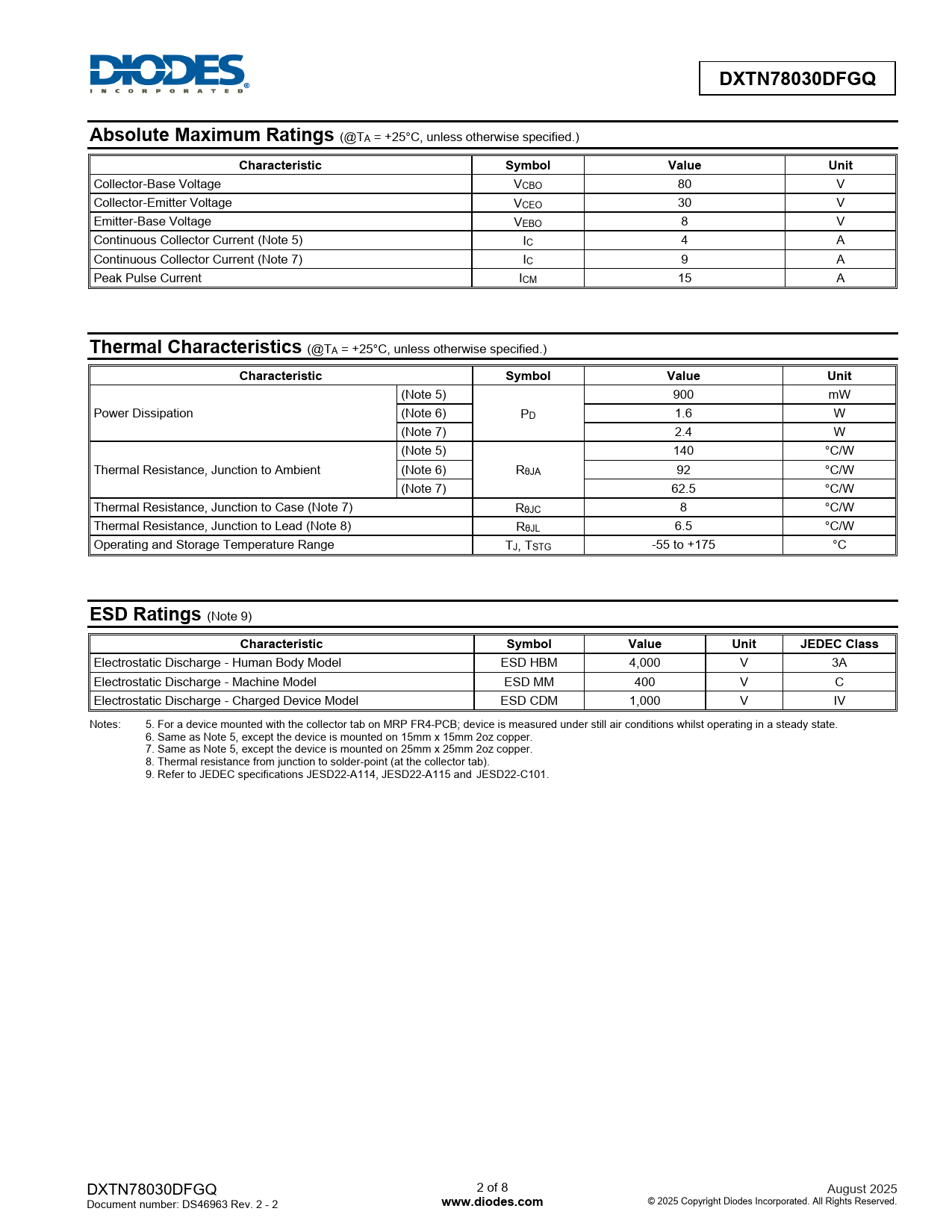Electrostatic Discharge - Human Body Model ESD HBM 4,000 V 3A Electrostatic Discharge - Machine Model ESD MM 400 V C Electrostatic Discharge - Charged Device Model ESD CDM 1,000 V IV Notes: 5. For a device mounted with the collector tab on MRP FR4-PCB; device is measured under still air conditions whilst operating in a steady state. 6. Same as Note 5, except the device is mounted on 15mm x 15mm 2oz copper. 7. Same as Note 5, except the device is mounted on 25mm x 25mm 2oz copper. 8. Thermal resistance from junction to solder-point (at the collector tab). 9. Refer to JEDEC specifications JESD22-A114, JESD22-A115 and JESD22-C101. DXTN78030DFGQ 2 of 8 August 2025 Document number: DS46963 Rev. 2 - 2