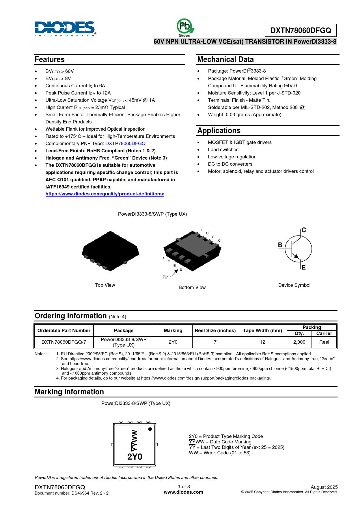 PowerDI3333-8/SWP DXTN78060DFGQ-7 2Y0 7 12 2,000 Reel (Type UX) Notes: 1. EU Directive 2002/95/EC (RoHS), 2011/65/EU (RoHS 2) & 2015/863/EU (RoHS 3) compliant. All applicable RoHS exemptions applied. 2. See https://www.diodes.com/quality/lead-free/ for more information about Diodes Incorporated’s definitions of Halogen- and Antimony-free, "Green" and Lead-free. 3. Halogen- and Antimony-free "Green” products are defined as those which contain <900ppm bromine, <900ppm chlorine (<1500ppm total Br + Cl) and <1000ppm antimony compounds. 4. For packaging details, go to our website at https://www.diodes.com/design/support/packaging/diodes-packaging/.
