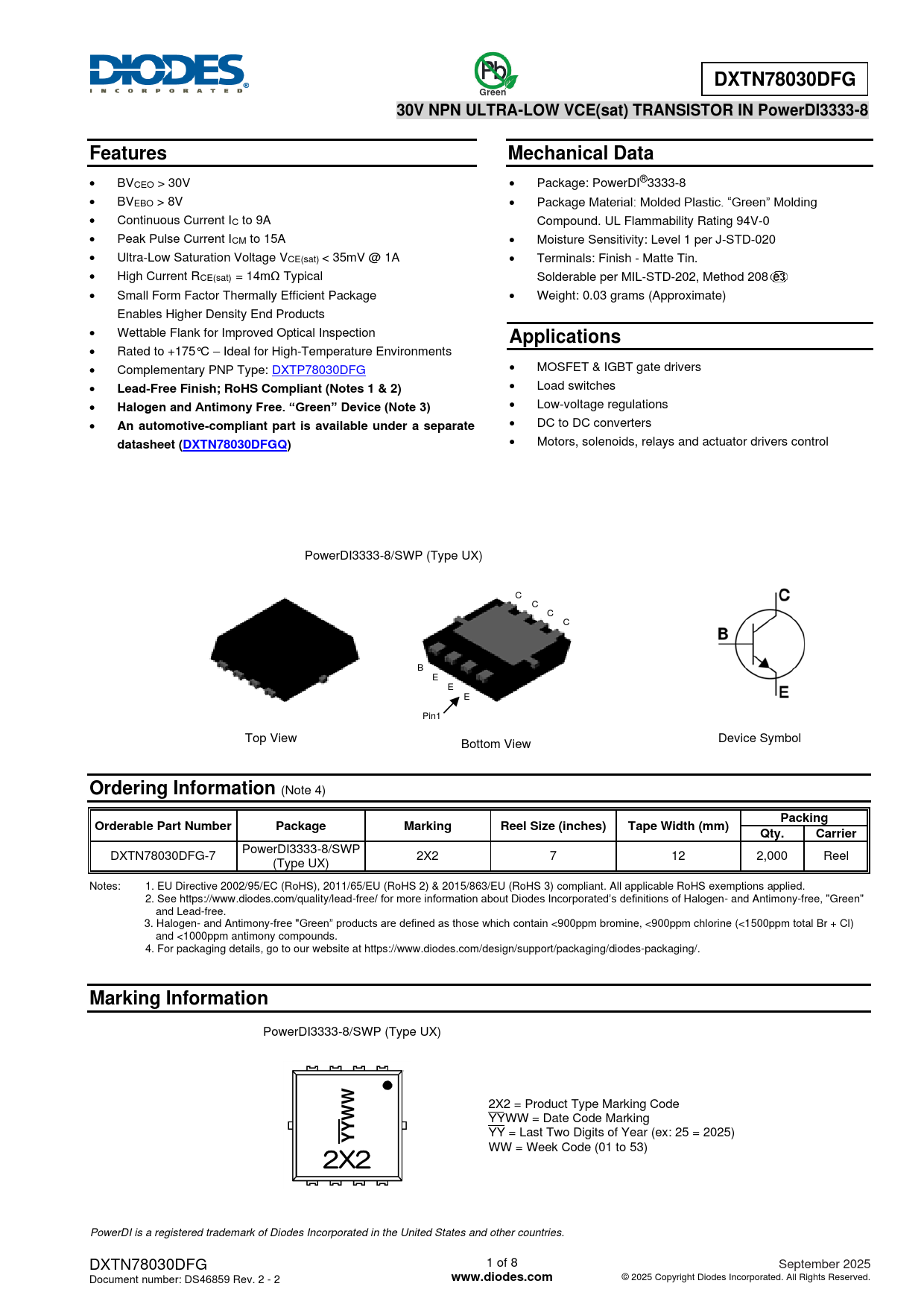 PowerDI3333-8/SWP DXTN78030DFG-7 2X2 7 12 2,000 Reel (Type UX) Notes: 1. EU Directive 2002/95/EC (RoHS), 2011/65/EU (RoHS 2) & 2015/863/EU (RoHS 3) compliant. All applicable RoHS exemptions applied. 2. See https://www.diodes.com/quality/lead-free/ for more information about Diodes Incorporated’s definitions of Halogen- and Antimony-free, "Green" and Lead-free. 3. Halogen- and Antimony-free "Green” products are defined as those which contain <900ppm bromine, <900ppm chlorine (<1500ppm total Br + Cl) and <1000ppm antimony compounds. 4. For packaging details, go to our website at https://www.diodes.com/design/support/packaging/diodes-packaging/.
