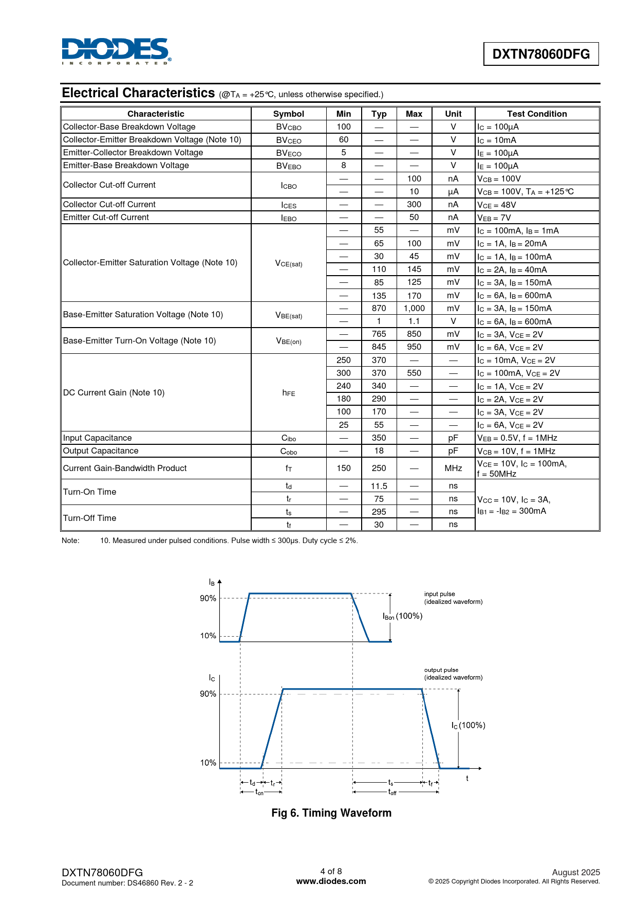 DXTN78060DFG. Electrical Characteristics. Characteristic. Symbol. Min. Typ. Max. Unit. Test Condition. Fig 6. Timing Waveform