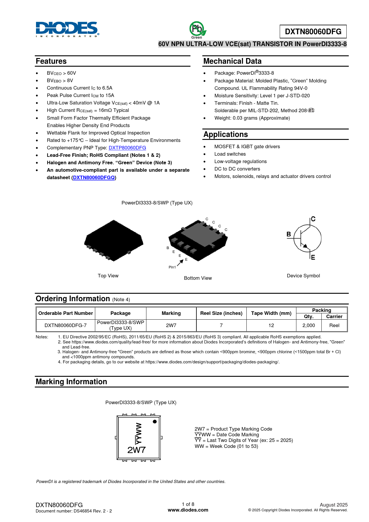 WW = Week Code (01 to 53) 2W7 PowerDI is a registered trademark of Diodes Incorporated in the United States and other countries. DXTN80060DFG 1 of 8 August 2025 Document number: DS46854 Rev. 2 - 2