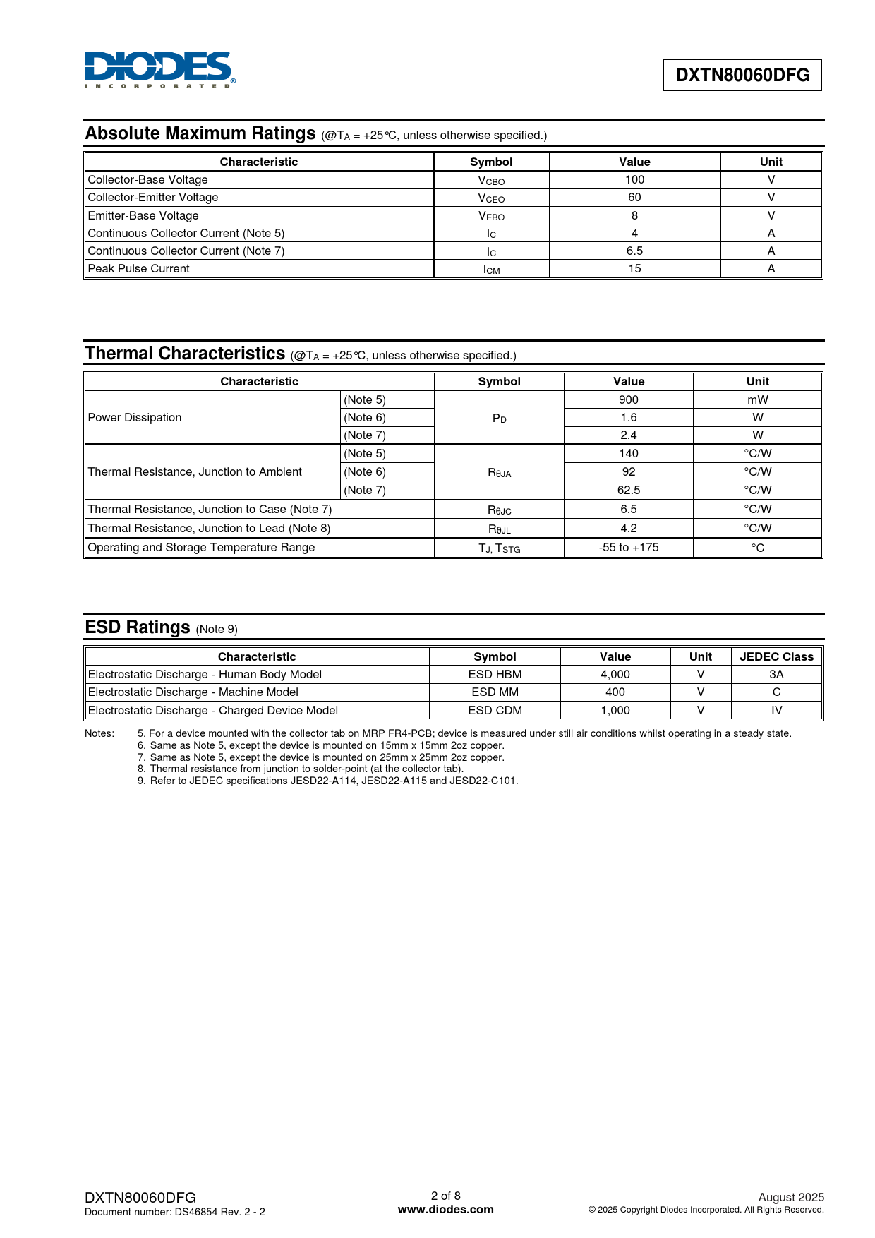 Electrostatic Discharge - Human Body Model ESD HBM 4,000 V 3A Electrostatic Discharge - Machine Model ESD MM 400 V C Electrostatic Discharge - Charged Device Model ESD CDM 1,000 V IV Notes: 5. For a device mounted with the collector tab on MRP FR4-PCB; device is measured under still air conditions whilst operating in a steady state. 6. Same as Note 5, except the device is mounted on 15mm x 15mm 2oz copper. 7. Same as Note 5, except the device is mounted on 25mm x 25mm 2oz copper. 8. Thermal resistance from junction to solder-point (at the collector tab). 9. Refer to JEDEC specifications JESD22-A114, JESD22-A115 and JESD22-C101. DXTN80060DFG 2 of 8 August 2025 Document number: DS46854 Rev. 2 - 2