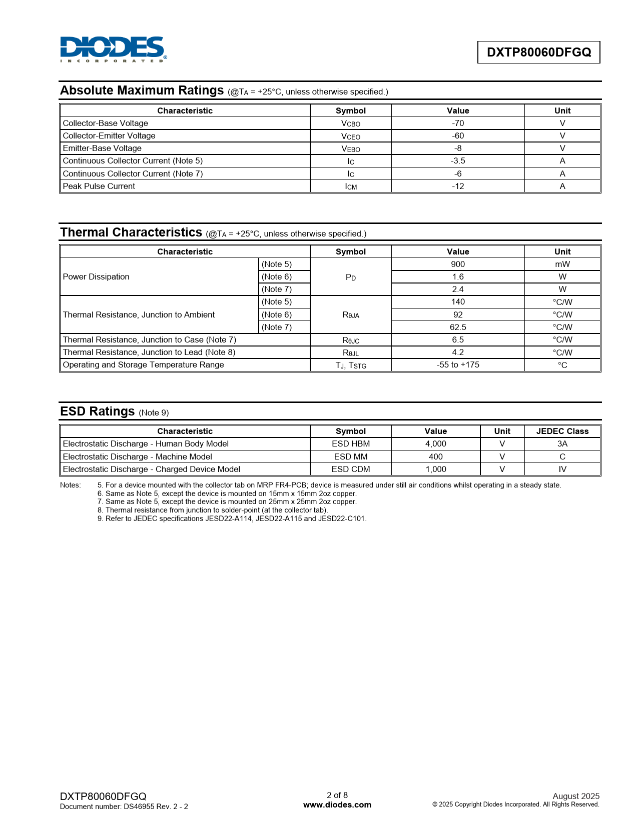 Electrostatic Discharge - Human Body Model ESD HBM 4,000 V 3A Electrostatic Discharge - Machine Model ESD MM 400 V C Electrostatic Discharge - Charged Device Model ESD CDM 1,000 V IV Notes: 5. For a device mounted with the collector tab on MRP FR4-PCB; device is measured under still air conditions whilst operating in a steady state. 6. Same as Note 5, except the device is mounted on 15mm x 15mm 2oz copper. 7. Same as Note 5, except the device is mounted on 25mm x 25mm 2oz copper. 8. Thermal resistance from junction to solder-point (at the collector tab). 9. Refer to JEDEC specifications JESD22-A114, JESD22-A115 and JESD22-C101. DXTP80060DFGQ 2 of 8 August 2025 Document number: DS46955 Rev. 2 - 2