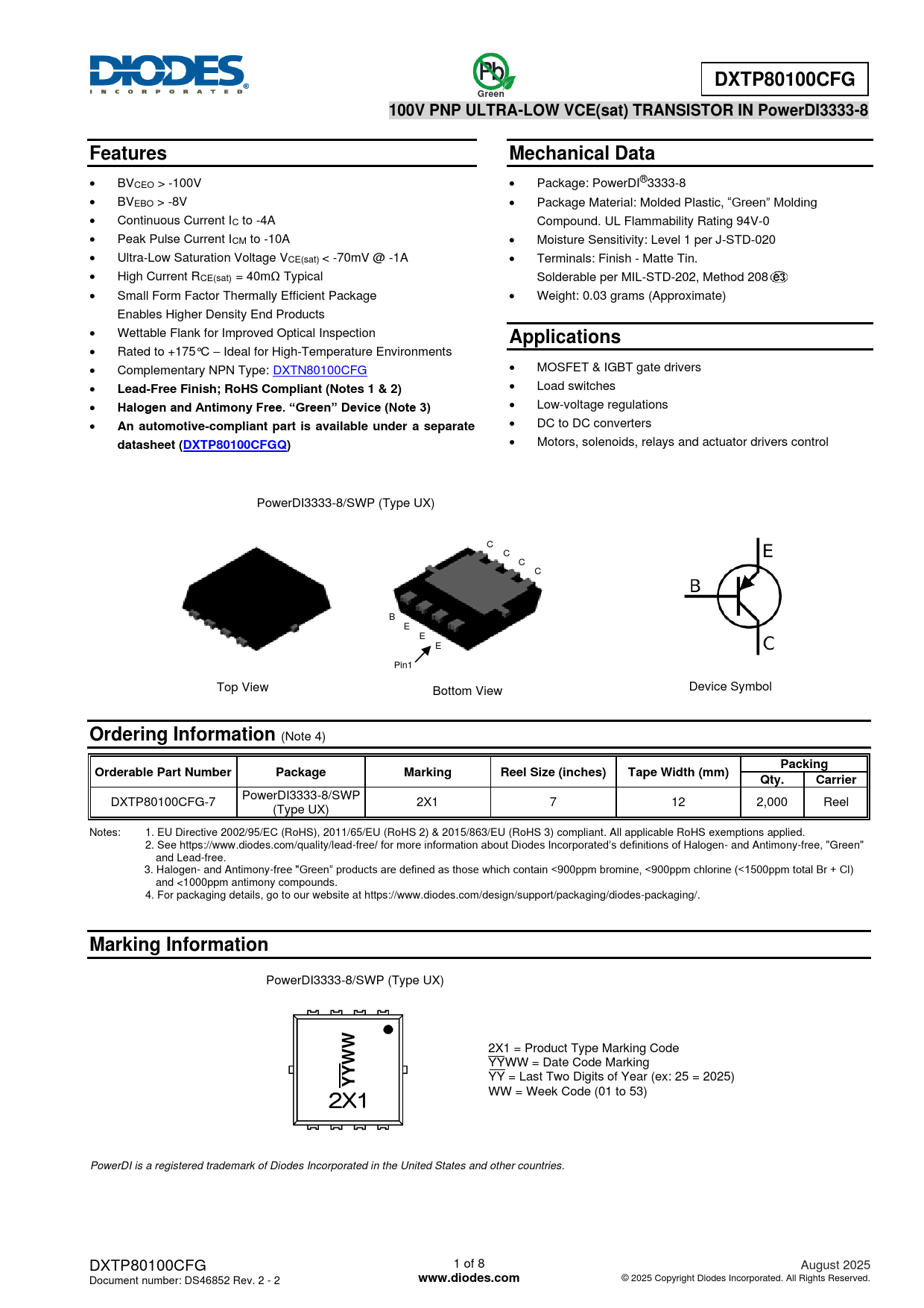 WW = Week Code (01 to 53) 2X1 PowerDI is a registered trademark of Diodes Incorporated in the United States and other countries. DXTP80100CFG 1 of 8 August 2025 Document number: DS46852 Rev. 2 - 2