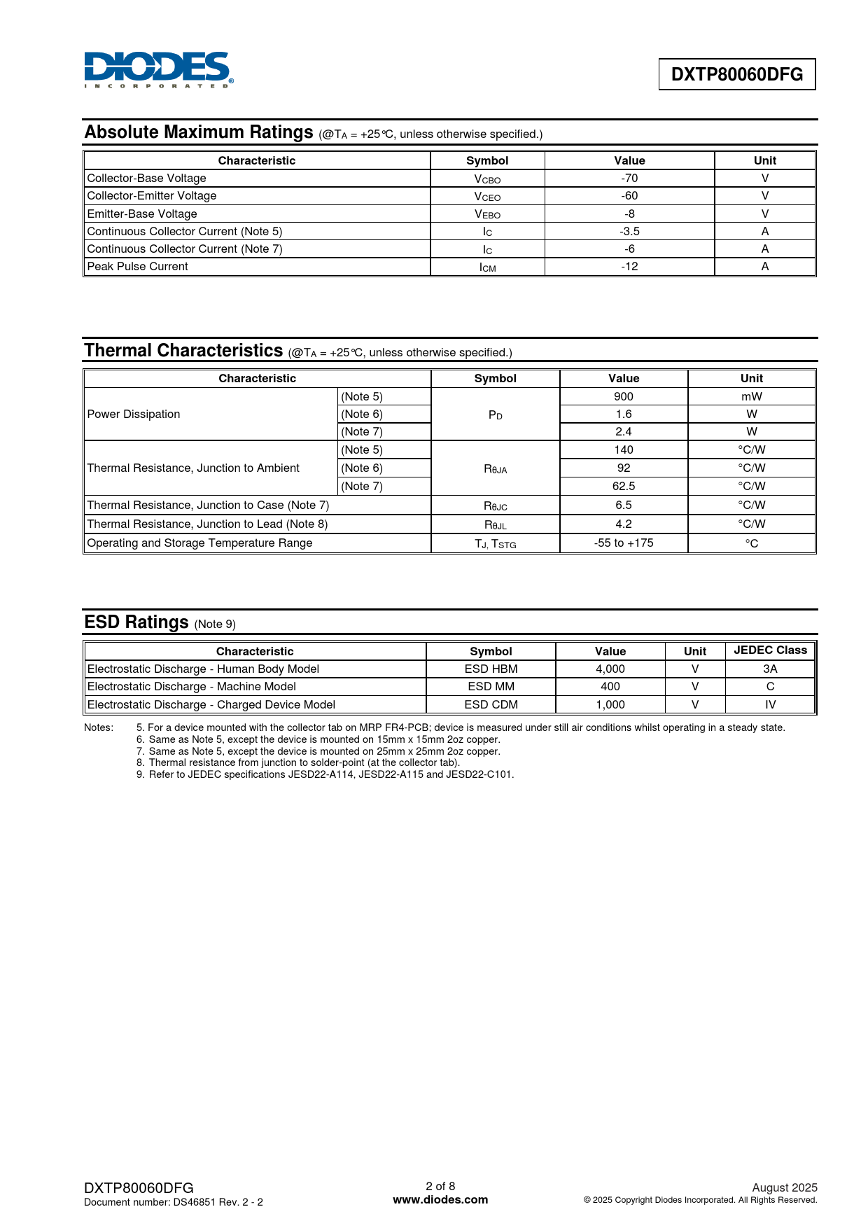 DXTP80060DFG. Absolute Maximum Ratings. Characteristic. Symbol. Value. Unit. Thermal Characteristics. ESD Ratings. JEDEC Class