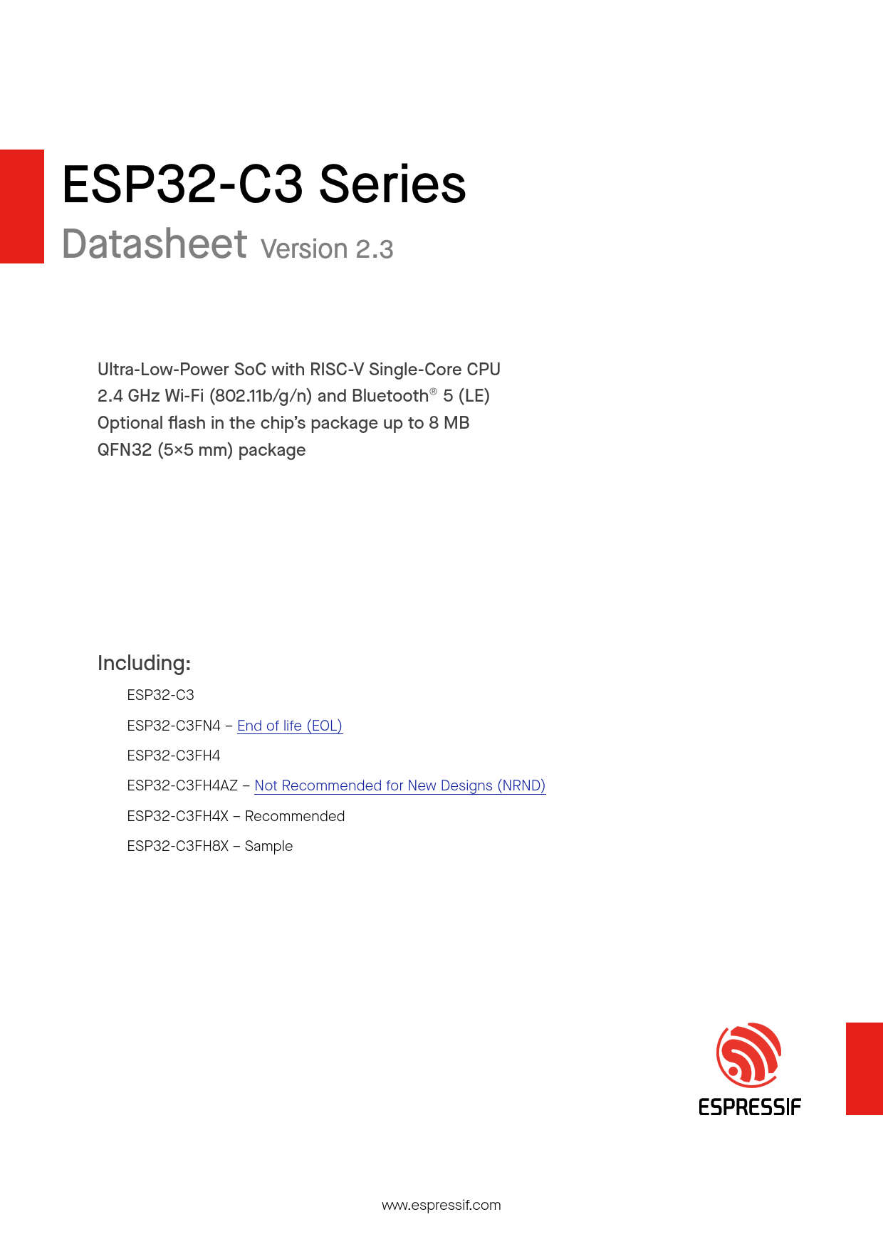 ESP32-C3. Series. Datasheet. Version. 2.3. Ultra-Low-Power. SoC. with. RISC-V. Single-Core. CPU. 2.4. GHz. Wi-Fi. (802.11b/g/n). and. Bluetooth®. 5. (LE)