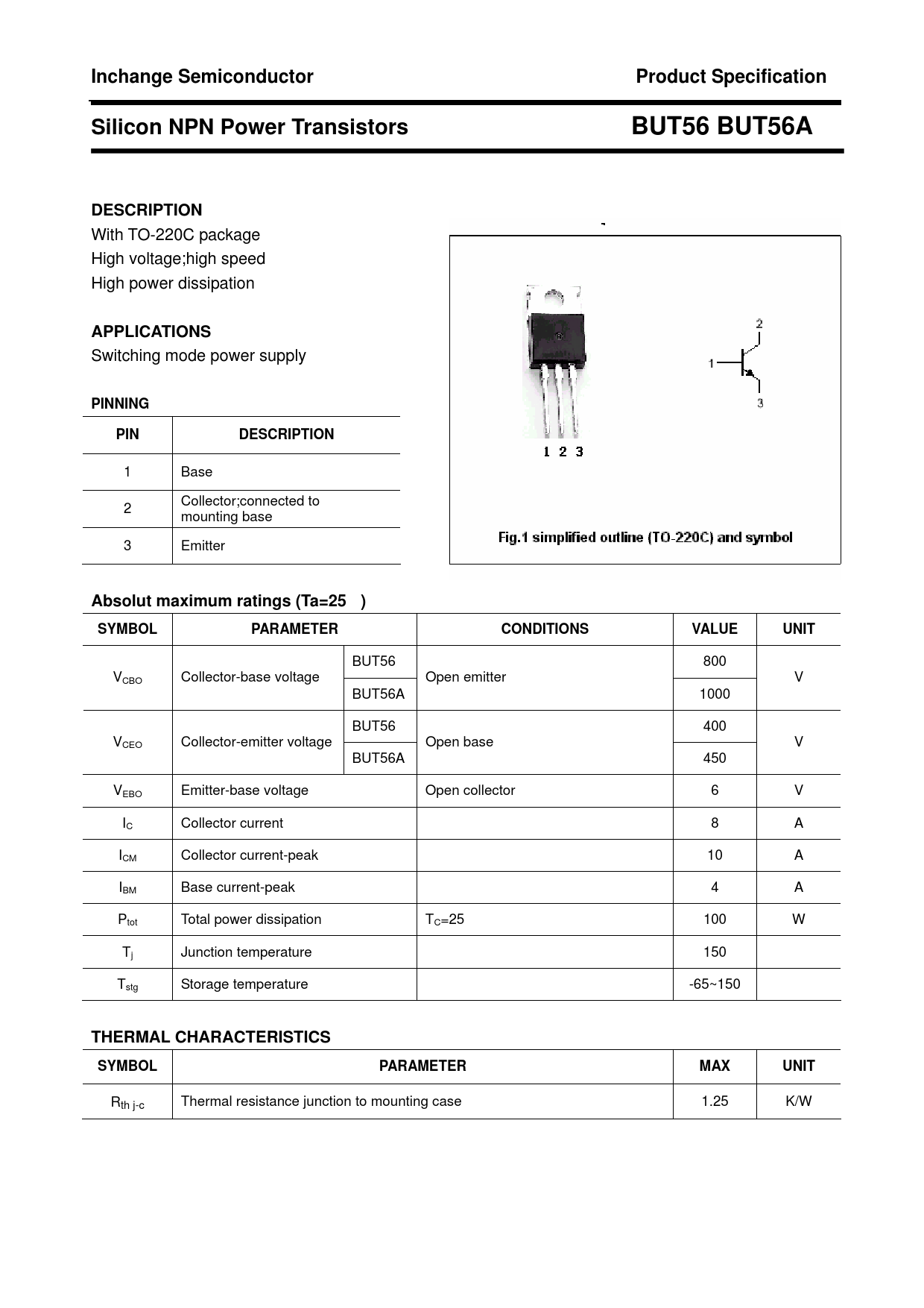 Inchange Semiconductor. Product Specification. Silicon NPN Power Transistors BUT56 BUT56A. DESCRIPTION. APPLICATIONS. PINNING