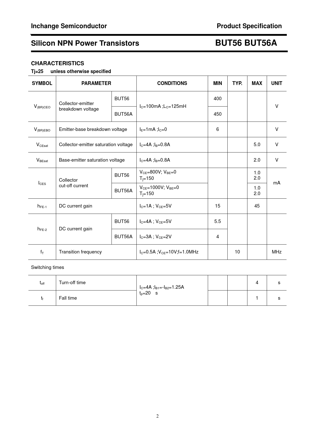 Inchange SemiconductorProduct SpecificationSilicon NPN Power Transistors BUT56 BUT56ACHARACTERISTICSTj=25 ℃ unless otherwise specifiedSYMBOL PARAMETERCONDITIONSMINTYP.MAXUNIT BUT56 400 Collector-emitter V(BR)CEO I V breakdown voltage C=100mA ;LC=125mH BUT56A 450 V(BR)EBO Emitter-base breakdown voltage IE=1mA ;IC=0 6 V VCEsat Collector-emitter saturation voltage IC=4A ;IB=0.8A 5.0 V VBEsat Base-emitter saturation voltage IC=4A ;IB=0.8A 2.0 V VCE=800V; VBE=0 1.0 BUT56 Tj=150℃ 2.0 Collector ICES mA cut-off current VCE=1000V; VBE=0 1.0 BUT56A Tj=150℃ 2.0 hFE-1 DC current gain IC=1A ; VCE=5V 15 45 BUT56 IC=4A ; VCE=5V 5.5 hFE-2 DC current gain BUT56A IC=3A ; VCE=2V 4 fT Transition frequency IC=0.5A ;VCE=10V;f=1.0MHz 10 MHz Switching times toff Turn-off time 4 μs IC=4A ;IB1=-IB2=1.25A tp=20μs tf Fall time 1 μs 2