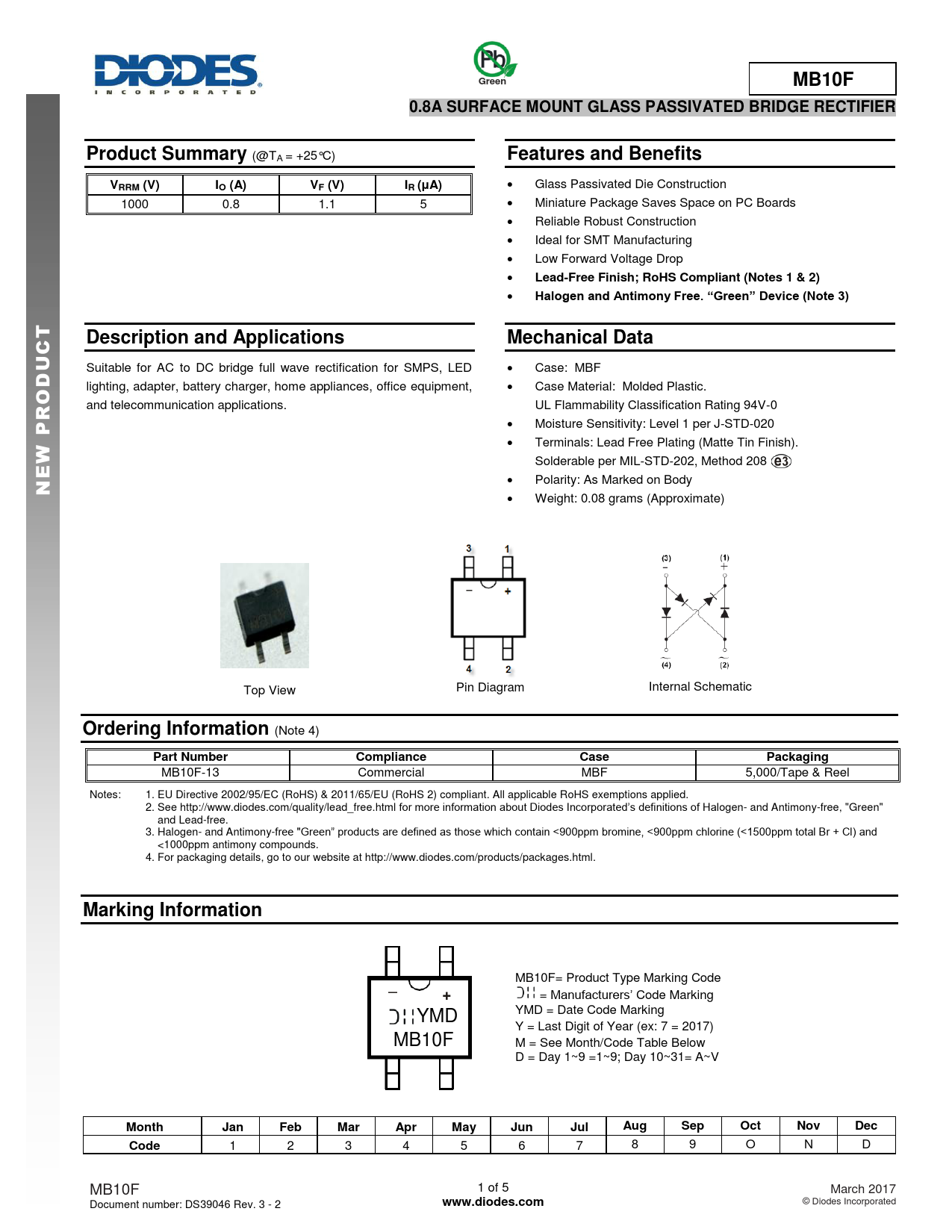 = Manufacturers’ Code Marking YMD = Date Code Marking YMD Y = Last Digit of Year (ex: 7 = 2017) MB10F M = See Month/Code Table Below D = Day 1~9 =1~9; Day 10~31= A~V