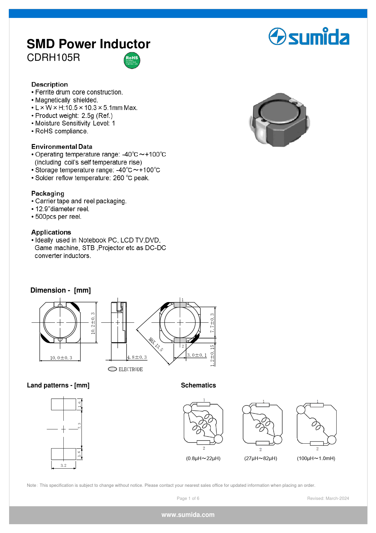 SMD Power Inductor. Dimension - [mm]. Land patterns - [mm] Schematics. www.sumida.com