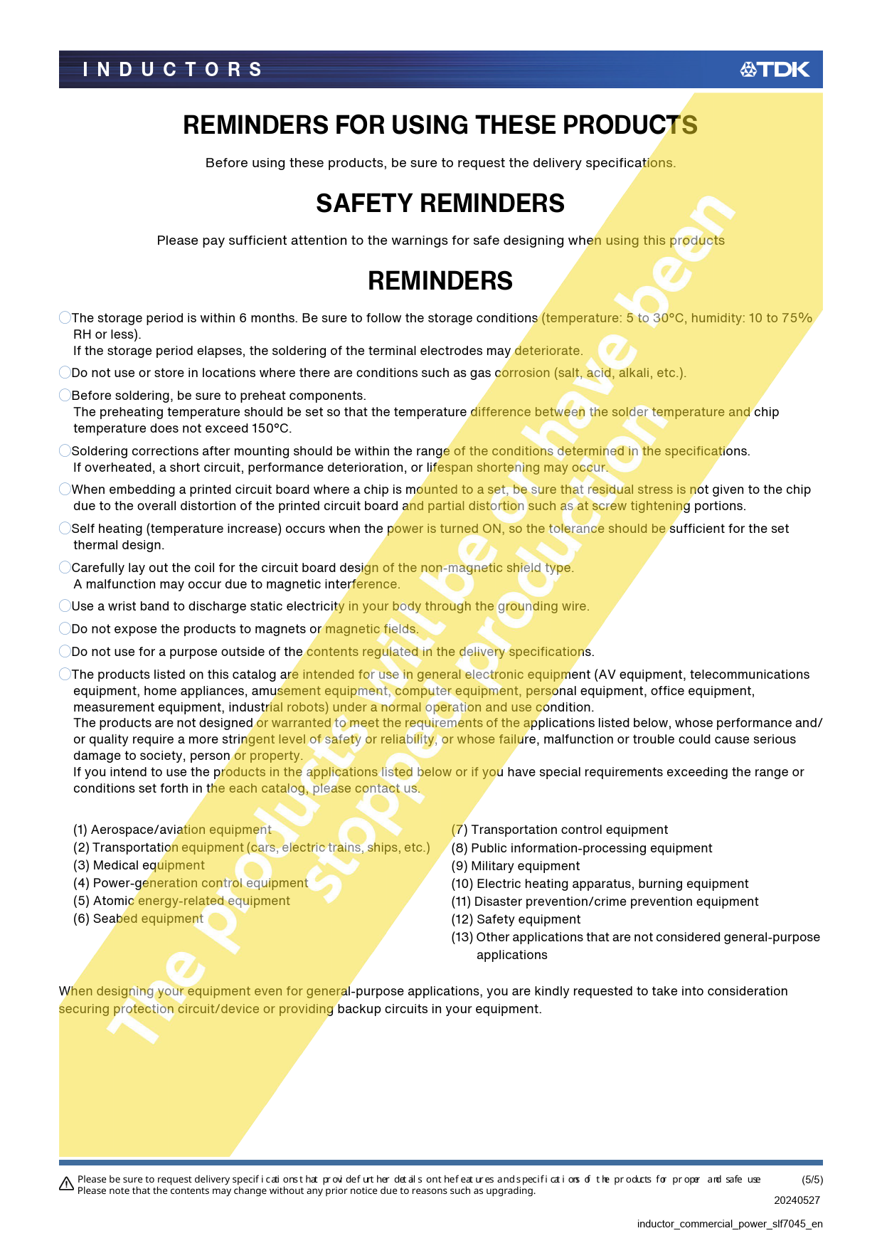 ◯The storage period is within 6 months. Be sure to fol ow the storage conditions (temperature: 5 to 30°C, humidity: 10 to 75% RH or less). If the storage period elapses, the soldering of the terminal electrodes may deteriorate. ◯Do not use or store in locations where there are conditions such as gas corrosion (salt, acid, alkali, etc.). ◯Before soldering, be sure to preheat components. The preheating temperature should be set so that the temperature difference between the solder temperature and chip temperature does not exceed 150°C. ◯Soldering corrections after mounting should be within the range of the conditions determined in the specifications. If overheated, a short circuit, performance deterioration, or lifespan shortening may occur. ◯When embedding a printed circuit board where a chip is mounted to a set, be sure that residual stress is not given to the chip due to the overal distortion of the printed circuit board and partial distortion such as at screw tightening portions. ◯Self heating (temperature increase) occurs when the power is turned ON, so the tolerance should be sufficient for the set thermal design. ◯Careful y lay out the coil for the circuit board design of the non-magnetic shield type. A malfunction may occur due to magnetic interference. ◯Use a wrist band to discharge static electricity in your body through the grounding wire. ◯Do not expose the products to magnets or magnetic fields. ◯Do not use for a purpose outside of the contents regulated in the delivery specifications. ◯The products listed on this catalog are intended for use in general electronic equipment (AV equipment, telecommunications equipment, home appliances, amusement equipment, computer equipment, personal equipment, office equipment, measurement equipment, industrial robots) under a normal operation and use condition. The products are not designed or warranted to meet the requirements of the applications listed below, whose performance and/ or quality require a more stringent level of safety or reliability, or whose failure, malfunction or trouble could cause serious damage to society, person or property. If you intend to use the products in the applications listed below or if you have special requirements exceeding the range or conditions set forth in the each catalog, please contact us. (1) Aerospace/aviation equipment (7) Transportation control equipment (2) Transportation equipment (cars, electric trains, ships, etc.) (8) Public information-processing equipment (3) Medical equipment (9) Military equipment (4) Power-generation control equipment (10) Electric heating apparatus, burning equipment (5) Atomic energy-related equipment (11) Disaster prevention/crime prevention equipment (6) Seabed equipment (12) Safety equipment (13) Other applications that are not considered general-purpose applications When designing your equipment even for general-purpose applications, you are kindly requested to take into consideration securing protection circuit/device or providing backup circuits in your equipment. Please be sure to request delivery specif i cati ons t hat pr ovi de f urt her det ail s on t he f eat ur es and s pecif i cat i ons of t he pr oducts for pr oper and safe use . (5/5) Please note that the contents may change without any prior notice due to reasons such as upgrading. 20240527 inductor_commercial_power_slf7045_en