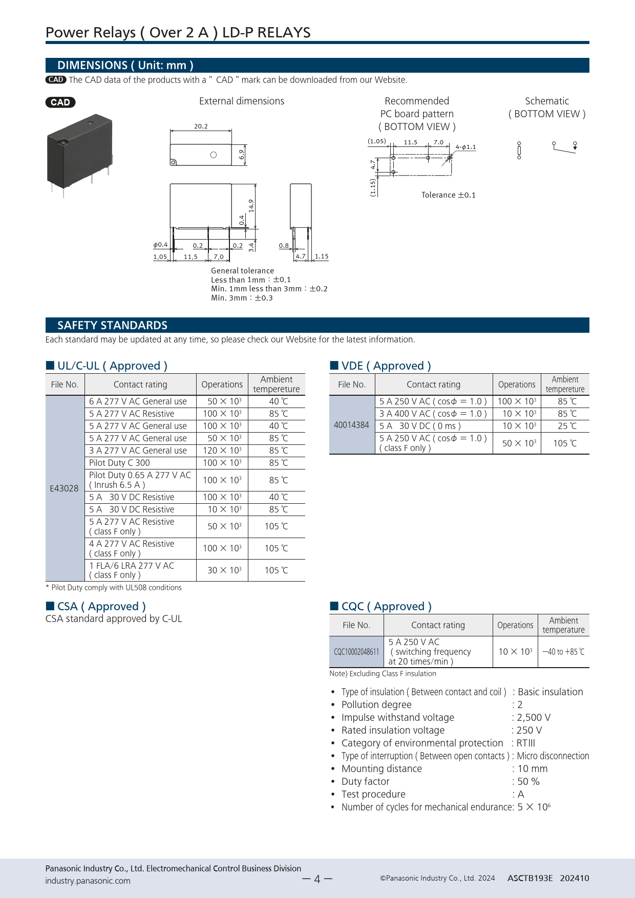 Power Relays ( Over 2 A ) LD-P RELAYS DIMENSIONS ( Unit: mm ) CAD The CAD data of the products with a CAD mark can be downloaded from our Website. CAD External dimensions Recommended Schematic PC board pattern ( BOTTOM VIEW ) 20.2 ( BOTTOM VIEW ) (1.05) 11.5 7.0 9 4-φ1.1 6. 7 4. ) 15 1.( Tolerance ±0.1 9. 14 4 0. φ0.4 0.2 0.2 4 0.8 3. 1.05 11.5 7.0 4.7 1.15 General tolerance Less than 1mm:±0.1 Min. 1mm less than 3mm:±0.2 Min. 3mm:±0.3 SAFETY STANDARDS Each standard may be updated at any time, so please check our Website for the latest information. ■ UL/C-UL ( Approved ) ■ VDE ( Approved ) Ambient Ambient File No. Contact rating Operations File No. Contact rating Operations tempereture tempereture 6 A 277 V AC General use 50 × 103 40 ℃ 5 A 250 V AC ( cosφ = 1.0 ) 100 × 103 85 ℃ 5 A 277 V AC Resistive 100 × 103 85 ℃ 3 A 400 V AC ( cosφ = 1.0 ) 10 × 103 85 ℃ 5 A 277 V AC General use 100 × 103 40 ℃ 40014384 5 A 30 V DC ( 0 ms ) 10 × 103 25 ℃ 5 A 277 V AC General use 50 × 103 85 ℃ 5 A 250 V AC ( cosφ = 1.0 ) 50 × 103 105 ℃ 3 A 277 V AC General use 120 × 103 85 ℃ ( class F only ) Pilot Duty C 300 100 × 103 85 ℃ Pilot Duty 0.65 A 277 V AC 100 × 103 85 ℃ E43028 ( Inrush 6.5 A ) 5 A 30 V DC Resistive 100 × 103 40 ℃ 5 A 30 V DC Resistive 10 × 103 85 ℃ 5 A 277 V AC Resistive 50 × 103 105 ℃ ( class F only ) 4 A 277 V AC Resistive 100 × 103 105 ℃ ( class F only ) 1 FLA/6 LRA 277 V AC 30 × 103 105 ℃ ( class F only ) * Pilot Duty comply with UL508 conditions ■ CSA ( Approved ) ■ CQC ( Approved ) CSA standard approved by C-UL Ambient File No. Contact rating Operations temperature 5 A 250 V AC CQC10002048611 ( switching frequency 10 × 103 ―40 to +85 ℃ at 20 times/min ) Note) Excluding Class F insulation • Type of insulation ( Between contact and coil ) : Basic insulation • Pollution degree : 2 • Impulse withstand voltage : 2,500 V • Rated insulation voltage : 250 V • Category of environmental protection : RTⅢ • Type of interruption ( Between open contacts ) : Micro disconnection • Mounting distance : 10 mm • Duty factor : 50 % • Test procedure : A • Number of cycles for mechanical endurance: 5 × 106 Panasonic Industry Co., Ltd. Electromechanical Control Business Division industry.panasonic.com Panasonic Industry Co., Ltd. 2024 ASCTB193E 202410 ー 4 ー