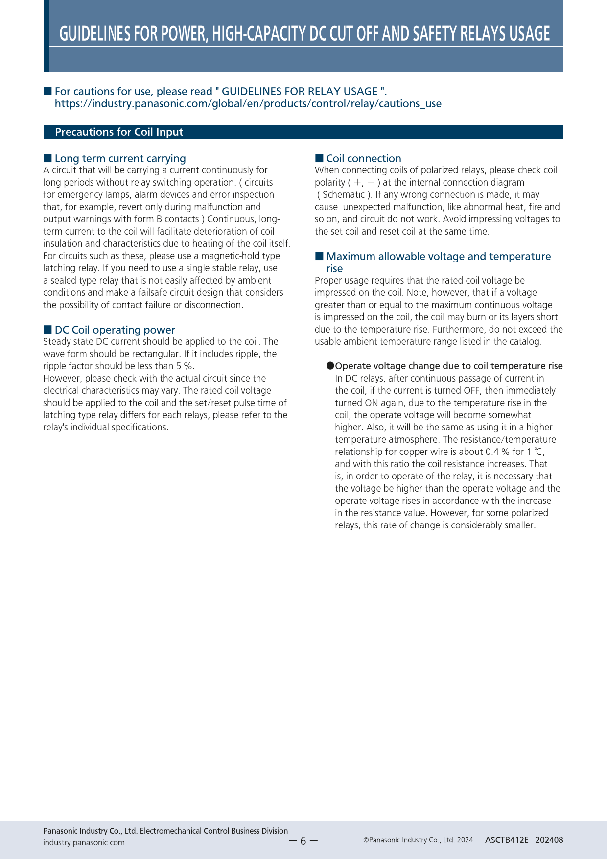 GUIDELINES FOR POWER, HIGH-CAPACITY DC CUT OFF AND SAFETY RELAYS USAGE ■ For cautions for use, please read " GUIDELINES FOR RELAY USAGE ". https://industry.panasonic.com/global/en/products/control/relay/cautions_use Precautions for Coil Input ■ Long term current carrying ■ Coil connection A circuit that will be carrying a current continuously for When connecting coils of polarized relays, please check coil long periods without relay switching operation. ( circuits polarity ( +, − ) at the internal connection diagram for emergency lamps, alarm devices and error inspection ( Schematic ). If any wrong connection is made, it may that, for example, revert only during malfunction and cause unexpected malfunction, like abnormal heat, fire and output warnings with form B contacts ) Continuous, long- so on, and circuit do not work. Avoid impressing voltages to term current to the coil will facilitate deterioration of coil the set coil and reset coil at the same time. insulation and characteristics due to heating of the coil itself. For circuits such as these, please use a magnetic-hold type ■ Maximum allowable voltage and temperature latching relay. If you need to use a single stable relay, use rise a sealed type relay that is not easily affected by ambient Proper usage requires that the rated coil voltage be conditions and make a failsafe circuit design that considers impressed on the coil. Note, however, that if a voltage the possibility of contact failure or disconnection. greater than or equal to the maximum continuous voltage is impressed on the coil, the coil may burn or its layers short ■ DC Coil operating power due to the temperature rise. Furthermore, do not exceed the Steady state DC current should be applied to the coil. The usable ambient temperature range listed in the catalog. wave form should be rectangular. If it includes ripple, the ripple factor should be less than 5 %. ● Operate voltage change due to coil temperature rise However, please check with the actual circuit since the In DC relays, after continuous passage of current in electrical characteristics may vary. The rated coil voltage the coil, if the current is turned OFF, then immediately should be applied to the coil and the set/reset pulse time of turned ON again, due to the temperature rise in the latching type relay differs for each relays, please refer to the coil, the operate voltage will become somewhat relay's individual specifications. higher. Also, it will be the same as using it in a higher temperature atmosphere. The resistance/temperature relationship for copper wire is about 0.4 % for 1 ℃, and with this ratio the coil resistance increases. That is, in order to operate of the relay, it is necessary that the voltage be higher than the operate voltage and the operate voltage rises in accordance with the increase in the resistance value. However, for some polarized relays, this rate of change is considerably smaller. Panasonic Industry Co., Ltd. Electromechanical Control Business Division industry.panasonic.com Panasonic Industry Co., Ltd. 2024 ASCTB412E 202408 ー 6 ー