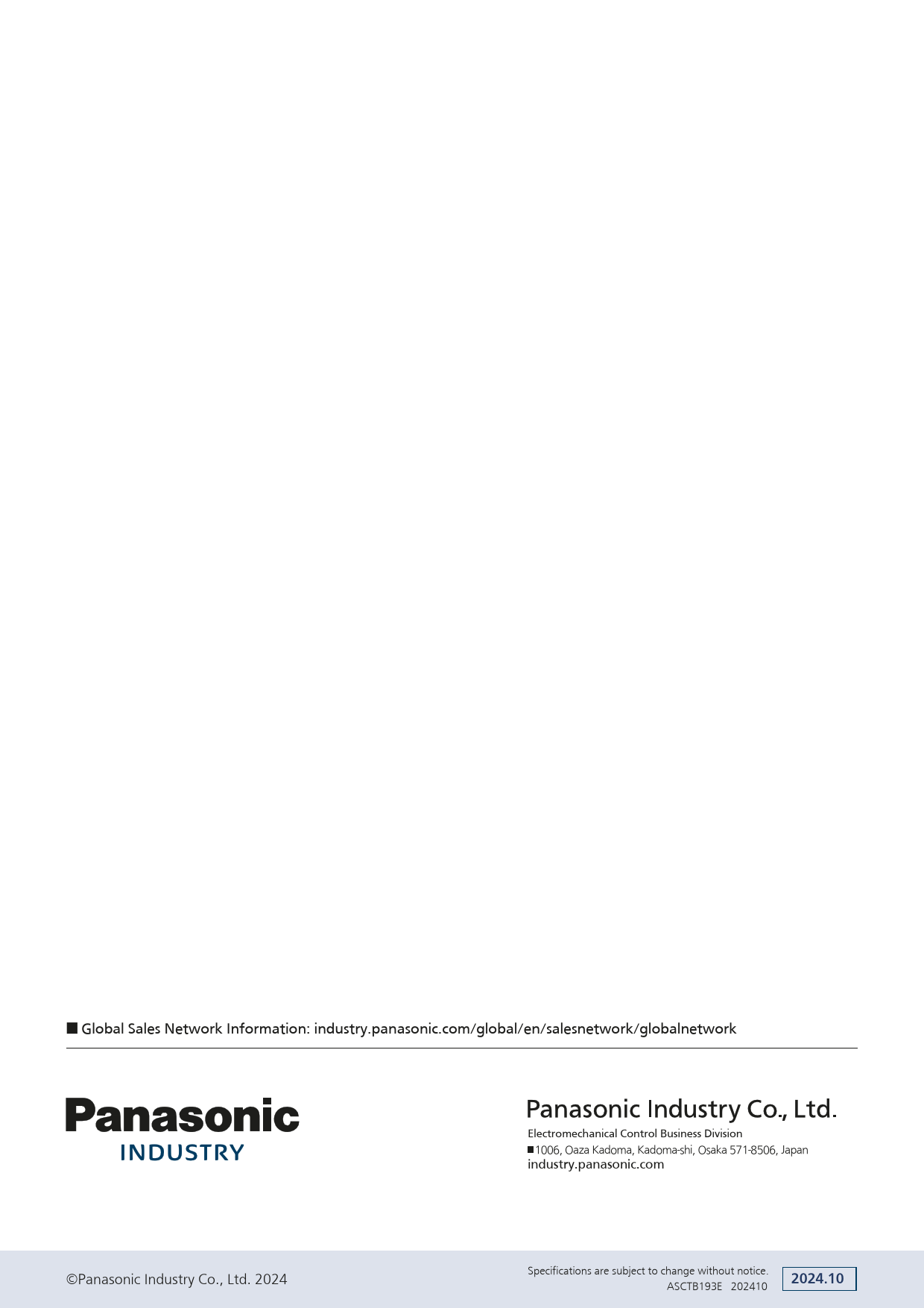 ■ Global Sales Network Information: industry.panasonic.com/global/en/salesnetwork/globalnetwork Electromechanical Control Business Division 1006, Oaza Kadoma, Kadoma-shi, Osaka 571-8506, Japan industry.panasonic.com Specifications are subject to change without notice. ©Panasonic Industry Co., Ltd. 2024 2024.10 モヴヤヵャヒペピユチチチビパビフヒパ