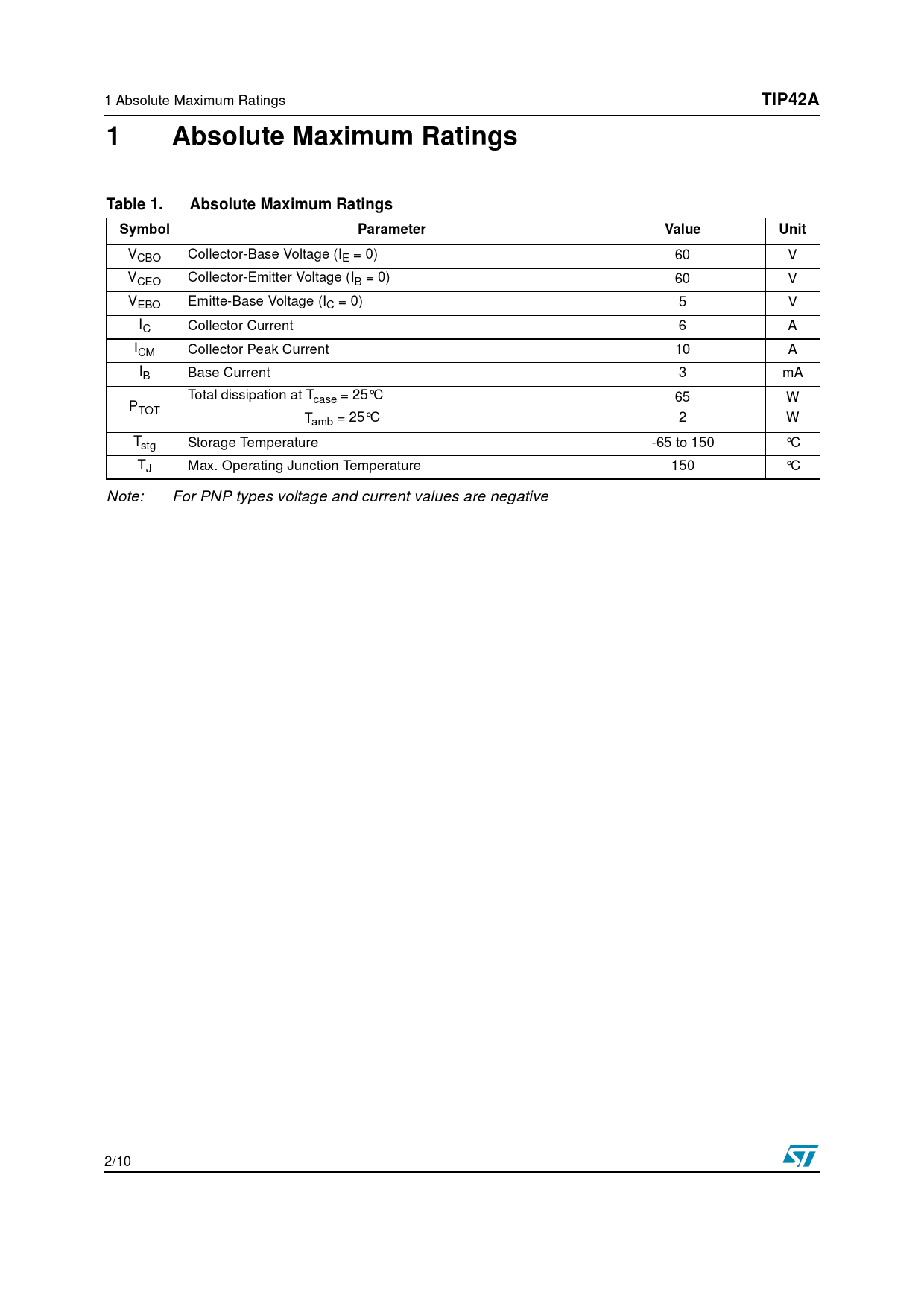 TIP42A. 1 Absolute. Maximum. Ratings. Table 1. Absolute Maximum Ratings. Symbol. Parameter. Value. Unit