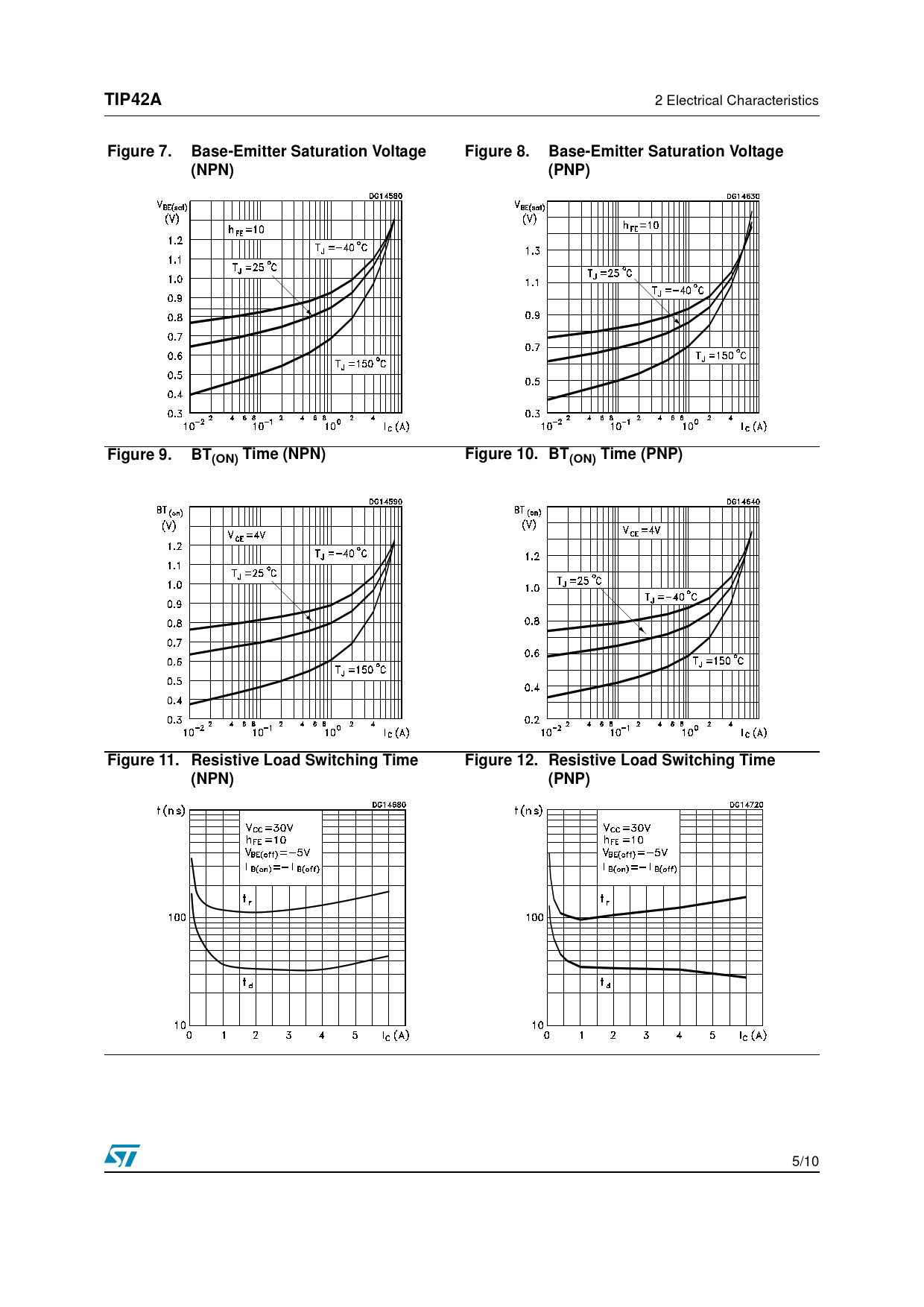 TIP42A. Figure 7. Base-Emitter Saturation Voltage. Figure 8. (NPN). (PNP). Figure 9. BT(ON) Time (NPN). Figure 10. BT(ON) Time (PNP)