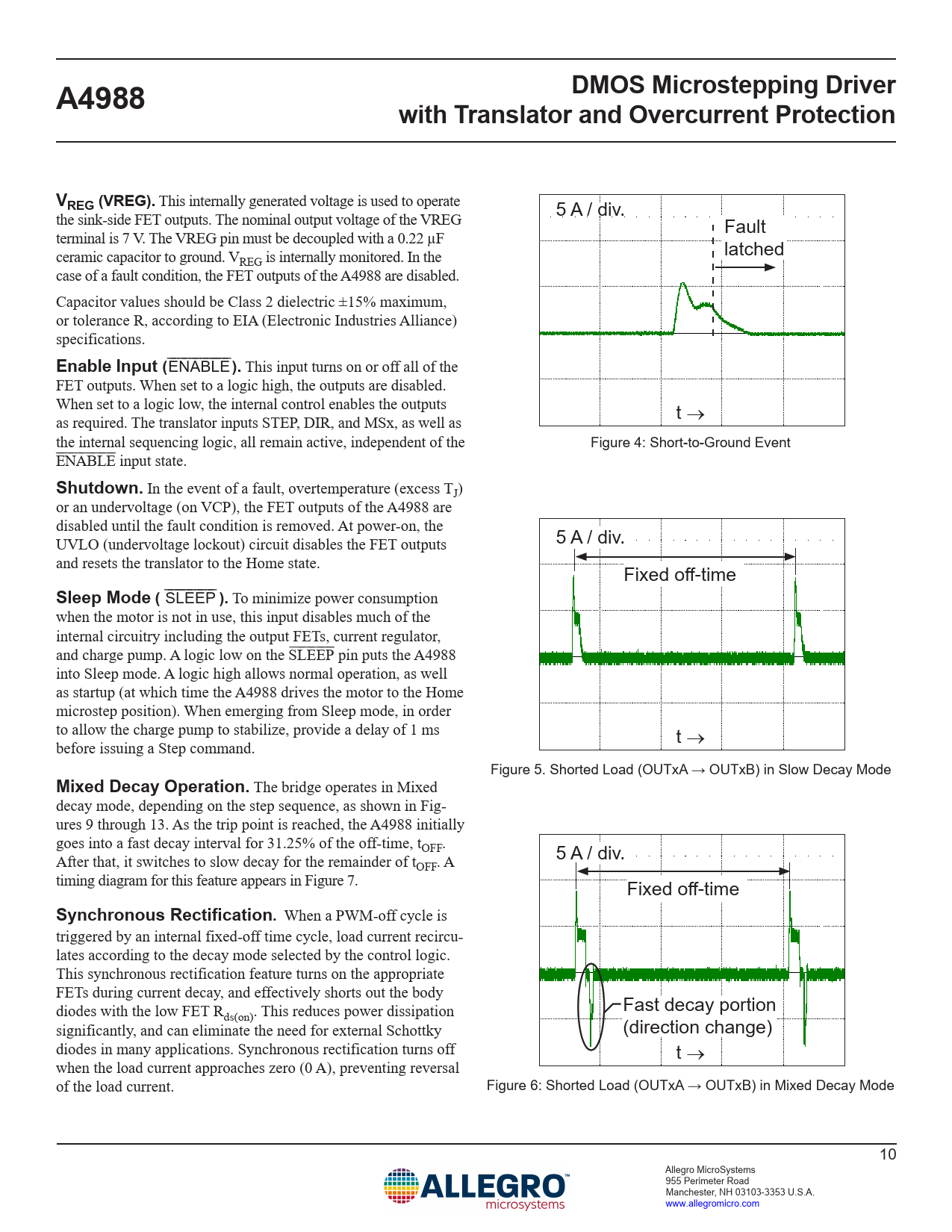 In the event of a fault, overtemperature (excess TJ) or an undervoltage (on VCP), the FET outputs of the A4988 are disabled until the fault condition is removed. At power-on, the UVLO (undervoltage lockout) circuit disables the FET outputs 5 A / div. and resets the translator to the Home state. Fixed off-time