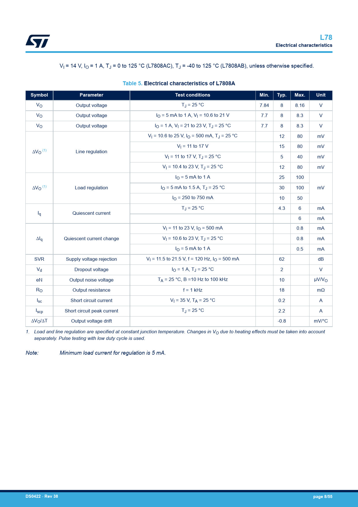 link to page 8 link to page 8 L78Electrical characteristics VI = 14 V, IO = 1 A, TJ = 0 to 125 °C (L7808AC), TJ = -40 to 125 °C (L7808AB), unless otherwise specified. Table 5. Electrical characteristics of L7808ASymbolParameterTest conditionsMin.Typ.Max.Unit VO Output voltage TJ = 25 °C 7.84 8 8.16 V VO Output voltage IO = 5 mA to 1 A, VI = 10.6 to 21 V 7.7 8 8.3 V VO Output voltage IO = 1 A, VI = 21 to 23 V, TJ = 25 °C 7.7 8 8.3 V VI = 10.6 to 25 V, IO = 500 mA, TJ = 25 °C 12 80 mV VI = 11 to 17 V 15 80 mV ∆V (1) O Line regulation VI = 11 to 17 V, TJ = 25 °C 5 40 mV VI = 10.4 to 23 V, TJ = 25 °C 12 80 mV IO = 5 mA to 1 A 25 100 ∆V (1) O Load regulation IO = 5 mA to 1.5 A, TJ = 25 °C 30 100 mV IO = 250 to 750 mA 10 50 TJ = 25 °C 4.3 6 mA Iq Quiescent current 6 mA VI = 11 to 23 V, IO = 500 mA 0.8 mA ∆Iq Quiescent current change VI = 10.6 to 23 V, TJ = 25 °C 0.8 mA IO = 5 mA to 1 A 0.5 mA SVR Supply voltage rejection VI = 11.5 to 21.5 V, f = 120 Hz, IO = 500 mA 62 dB Vd Dropout voltage IO = 1 A, TJ = 25 °C 2 V eN Output noise voltage TA = 25 °C, B =10 Hz to 100 kHz 10 µV/VO RO Output resistance f = 1 kHz 18 mΩ Isc Short circuit current VI = 35 V, TA = 25 °C 0.2 A Iscp Short circuit peak current TJ = 25 °C 2.2 A ∆VO/∆T Output voltage drift -0.8 mV/°C 1. Load and line regulation are specified at constant junction temperature. Changes in VO due to heating effects must be taken into account separately. Pulse testing with low duty cycle is used. Note: Minimum load current for regulation is 5 mA. DS0422 - Rev 38page 8/55 Document Outline L78 1 Diagram 2 Pin configuration 3 Maximum ratings 4 Test circuits 5 Electrical characteristics 6 Application information 6.1 Design consideration 7 Typical performance 8 Package information 8.1 TO-220 (dual gauge) package information 8.2 TO-220 (single gauge) package information 8.3 TO-220FP type A package information 8.4 TO-220 (single/dual) packing information 8.5 DPAK package information 8.6 D²PAK (SMD 2L STD-ST) type A package information 8.7 D²PAK (ASE) type B package information 8.8 D²PAK and DPAK packing information 9 Ordering information Revision history Contents List of tables List of figures