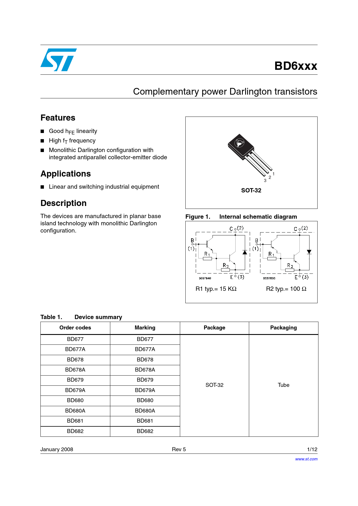BD677 BD677 BD677A BD677A BD678 BD678 BD678A BD678A BD679 BD679 SOT-32 Tube BD679A BD679A BD680 BD680 BD680A BD680A BD681 BD681 BD682 BD682 January 2008 Rev 5 1/12 www.st.com 12 Document Outline Figure 1. Internal schematic diagram Table 1. Device summary 1 Absolute maximum ratings Table 2. Absolute maximum ratings 2 Electrical characteristics Table 3. Electrical characteristics 2.1 Typical characteristic (curves) Figure 2. DC current gain (NPN) Figure 3. DC current gain (PNP) Figure 4. DC current gain (NPN) Figure 5. DC current gain (PNP) Figure 6. Collector-emitter saturation voltage (NPN) Figure 7. Collector-emitter saturation voltage (PNP) Figure 8. Base-emitter saturation voltage (NPN) Figure 9. Base-emitter saturation voltage (PNP) Figure 10. Base-emitter voltage (NPN) Figure 11. Base-emitter voltage (PNP) Figure 12. Resistive load switching time (NPN, on) Figure 13. Resistive load switching time (PNP, on) Figure 14. Resistive load switching time (NPN, off) Figure 15. Resistive load switching time (PNP, off) 2.2 Test circuit Figure 16. Resistive load switching test circuit 3 Package mechanical data 4 Revision history Table 4. Document revision history