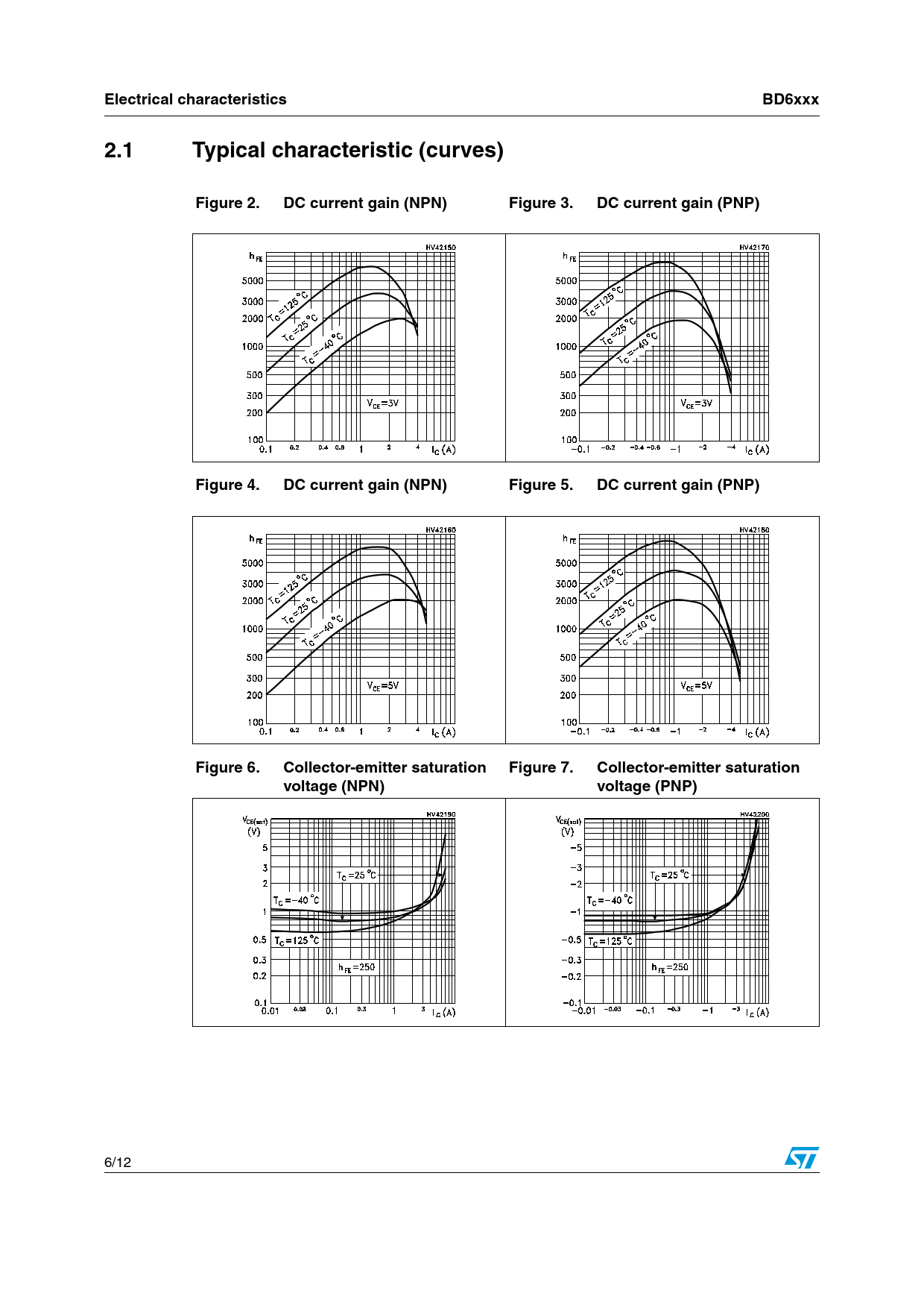 Electrical characteristics BD6xxx 2.1 Typical characteristic (curves) Figure 2. DC current gain (NPN) Figure 3. DC current gain (PNP) Figure 4. DC current gain (NPN) Figure 5. DC current gain (PNP) Figure 6. Collector-emitter saturation Figure 7. Collector-emitter saturation voltage (NPN) voltage (PNP)